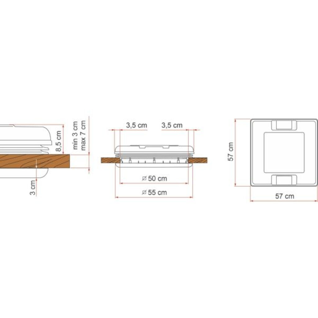 Elegante dakluik met standaardafmeting 50 x 50 cm. Dankzij het lage ontwerp blijft het geluidsniveau laag, zelfs bij rijden op hogere snelheden. Het luik kan van alle vier de zijden worden geopend. Het brede, versterkte frame maakt het mogelijk om dakluiken te vervangen met afmetingen van 50 x 50 tot 53 x 53 cm. Gemaakt van sterk en UV-bestendig plastic.