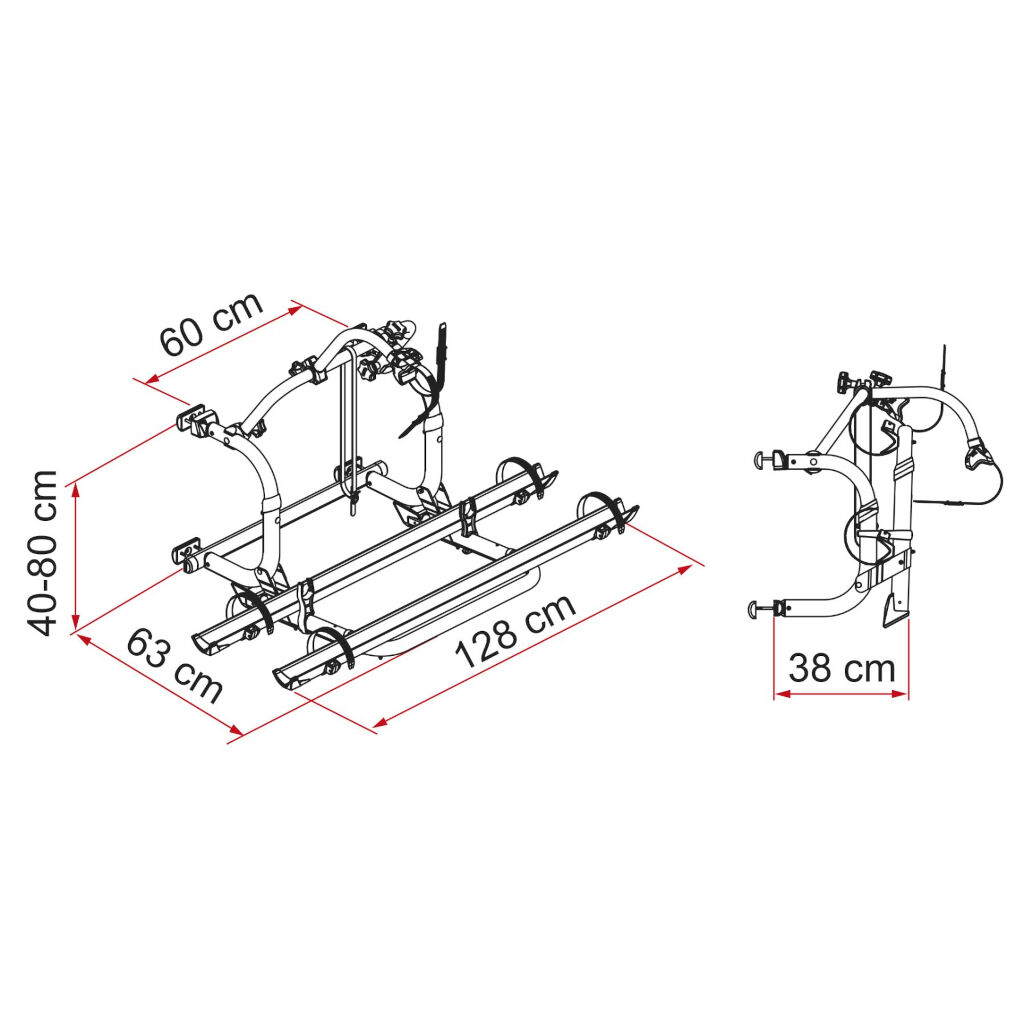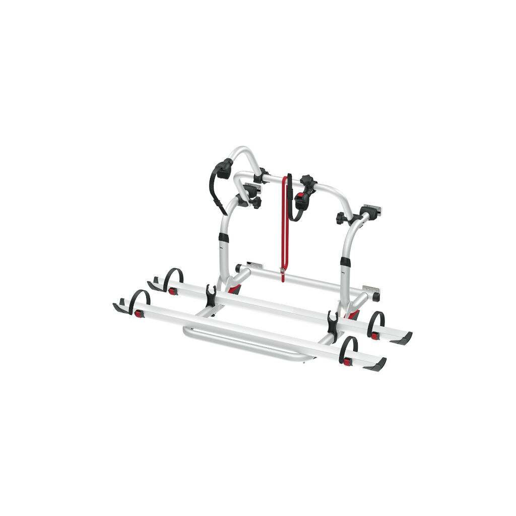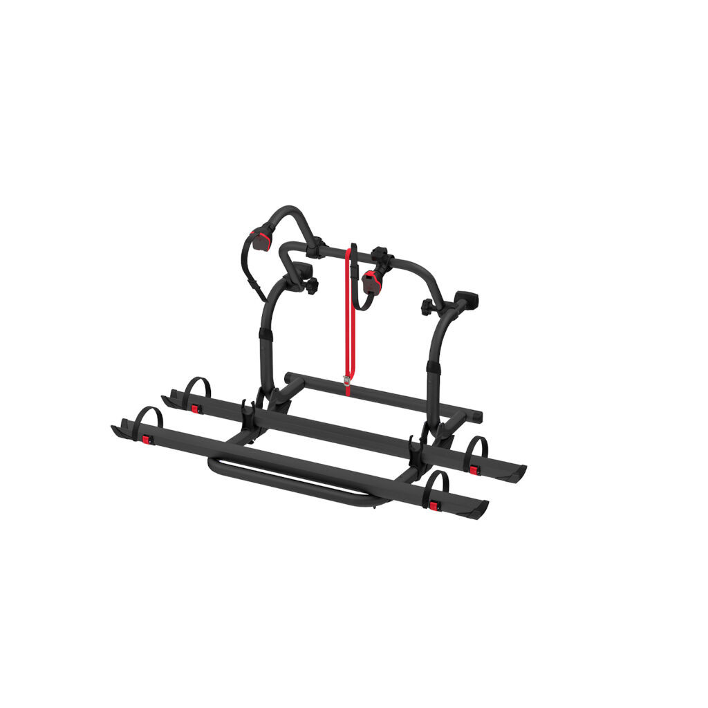 Fietsenrek voor campers met een verstelbare montagemaat tussen 40 en 80 cm. Het rek is voorbereid voor twee fietsen maar kan worden uitgebreid tot vier. De fietsenhouder kan eenvoudig worden opgeklapt wanneer deze niet in gebruik is. De lage montagehoogte maakt het ook geschikt voor campers met een achterraam.