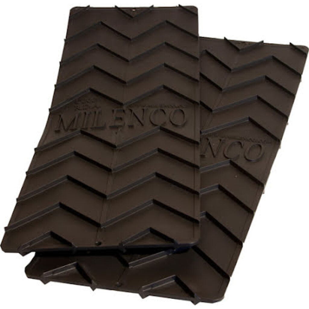 Stevige antislipmatten met een patroon dat extra goede grip biedt. Perfect voor natte grasvelden, modderige staanplaatsen of winterkamperen. 2 stuks per verpakking.