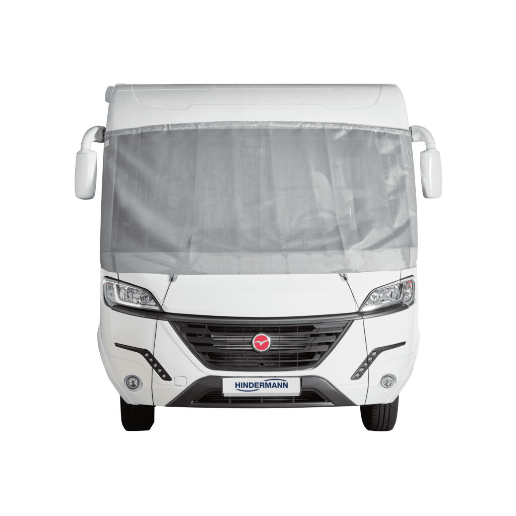 Universele zonnescherm van het Duitse merk Hindermann dat een volledig geïntegreerd zonnescherm is dat aan de buitenkant van de camper wordt bevestigd. Het zonnescherm houdt de zonnestralen buiten terwijl je nog steeds van binnenuit de camper naar buiten kunt kijken. Bedekt de voorruit.