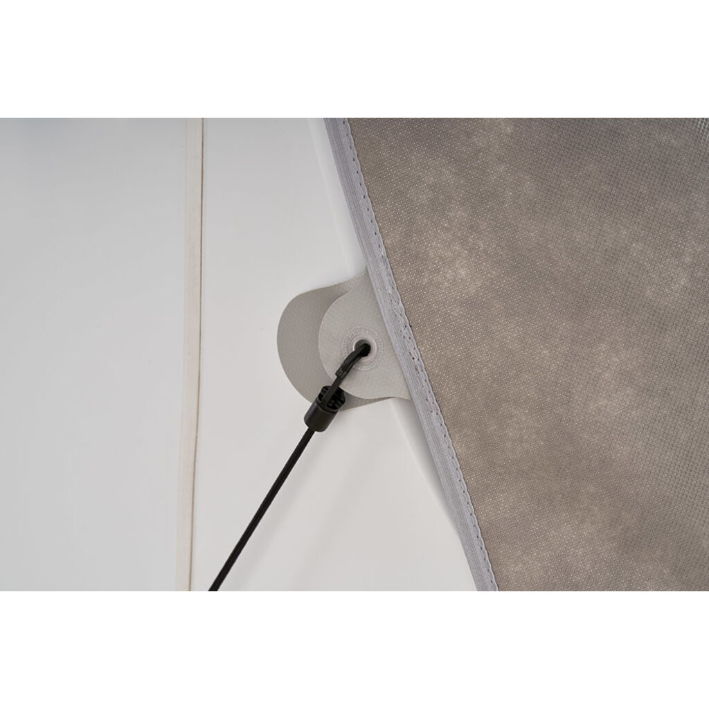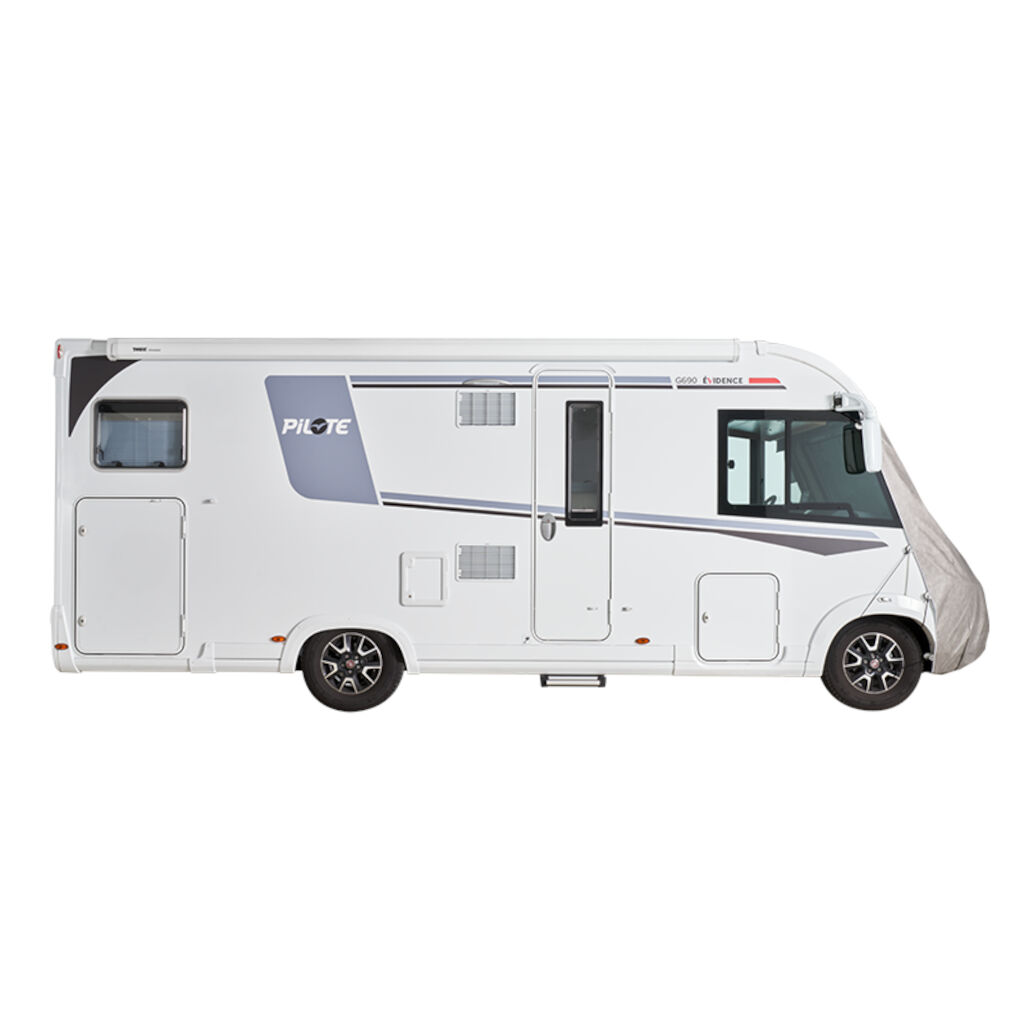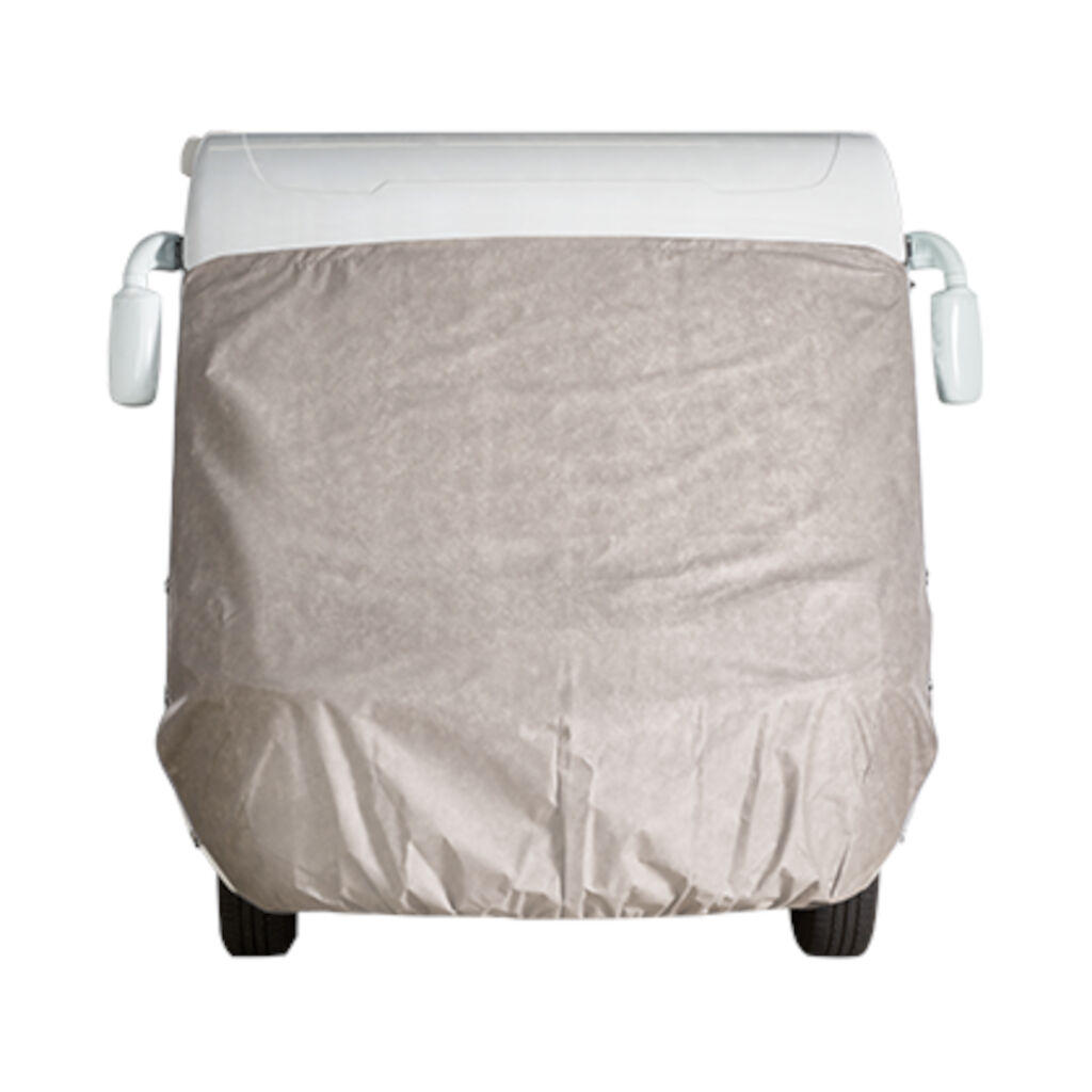 Universele voorbescherming voor geïntegreerde campers van Hindermann, beschikbaar in 2 maten. Beschermt de camper tegen vuil, sneeuw en ijsopbouw en is geïmpregneerd om water en vuil af te stoten zodat algen, mos en bloempollen geen grip krijgen. Het wordt aan de zijkanten bevestigd met gelusde koorden en rubberen spanners. Een geïntegreerde elastische band zorgt voor een afdichting langs de onderrand en elastische gespen dichten langs de bovenrand. De bescherming wordt bevestigd aan de bevestigingen voor de buitenspiegels die aan de bovenkant zijn bevestigd. Perfect voor langdurige bescherming wanneer de camper niet wordt gebruikt.