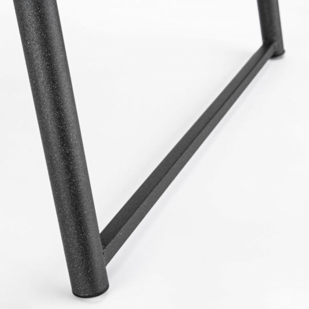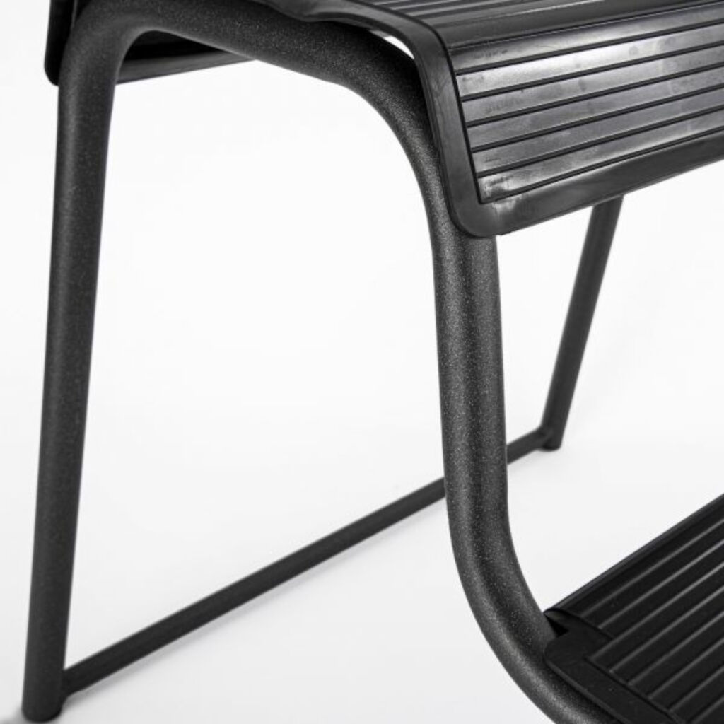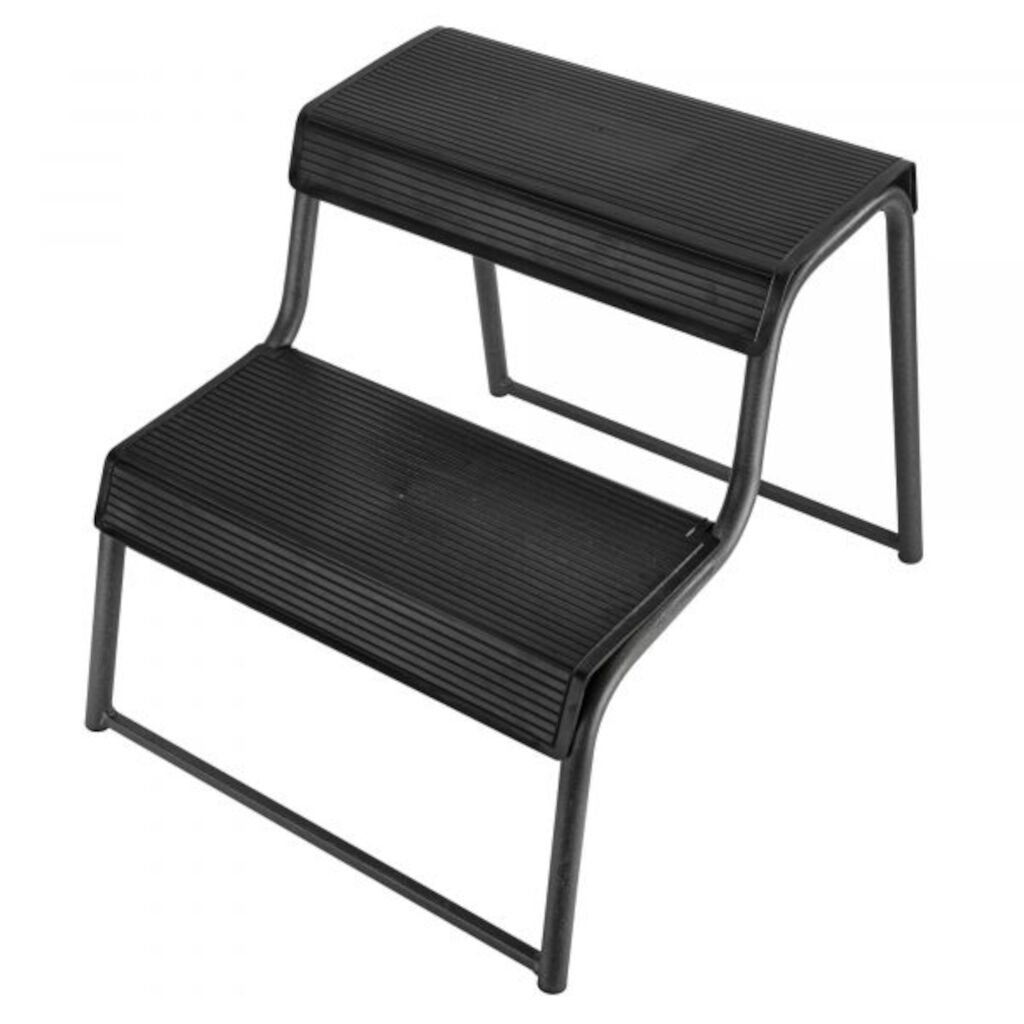 Dubbele trap in poedergecoat staal met antislip en een laagliggende rail die voorkomt dat de trap in de grond zakt. De antislip kan worden vervangen en extra worden aangeschaft.