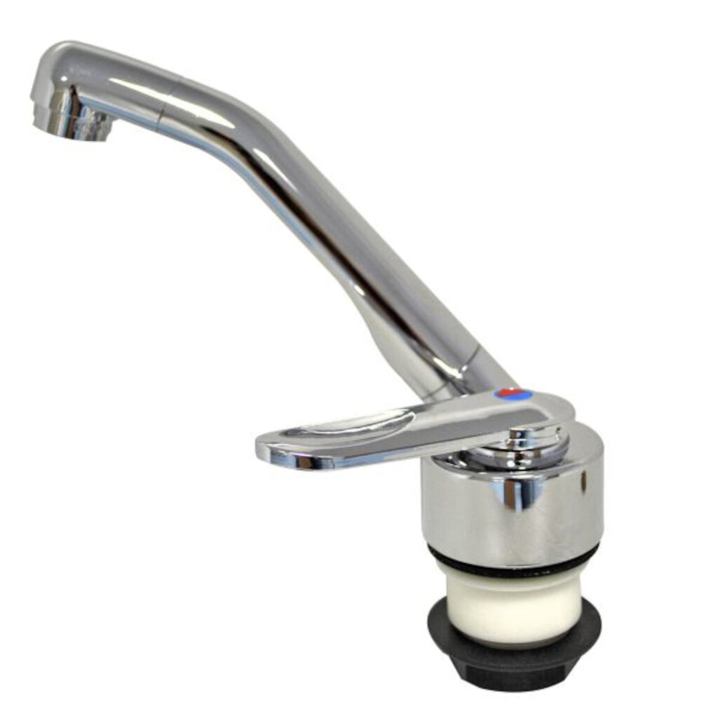 Keukenmengkraan voor caravan en camper van het Duitse merk Comet met een 150 mm lange uitloop die 90° kan draaien. Geschikt voor spoelbakken met deksel met een hoogte van 40 mm in ingeklapte stand. Een keramische inzetstuk zorgt voor een lange levensduur en kan eenvoudig worden vervangen als er problemen zijn met de afdichting.