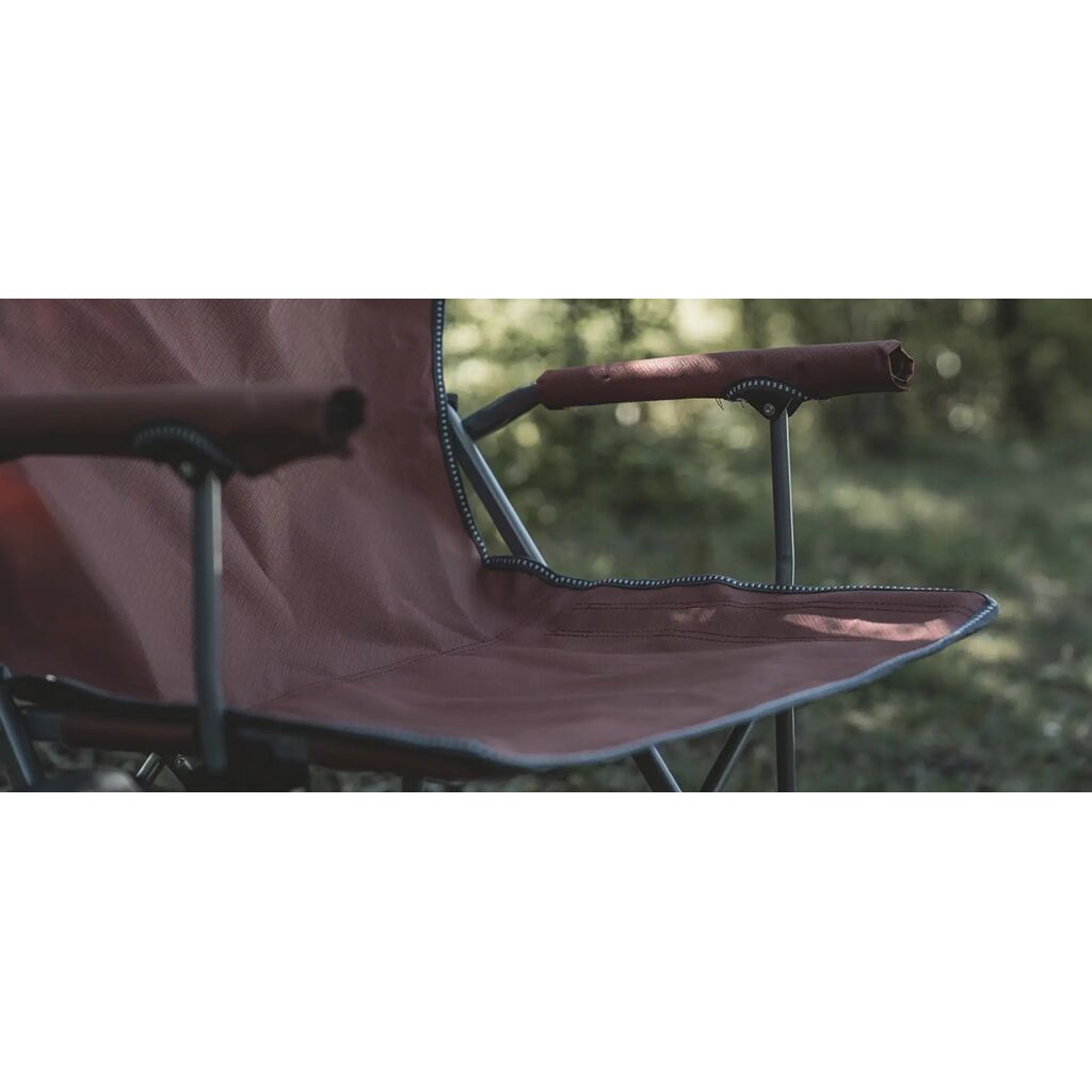 Compact in te pakken campingstoel met robuust stalen frame, gewatteerde armleuningen en bekerhouder. Draagt tot 110 kg.
