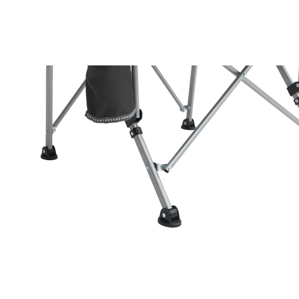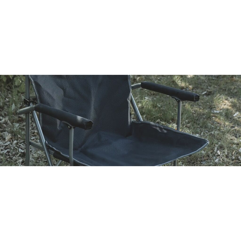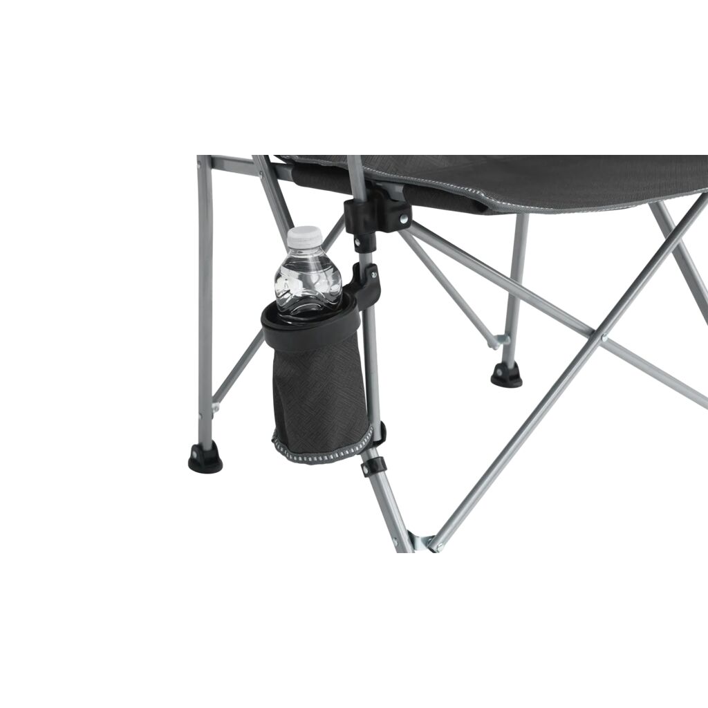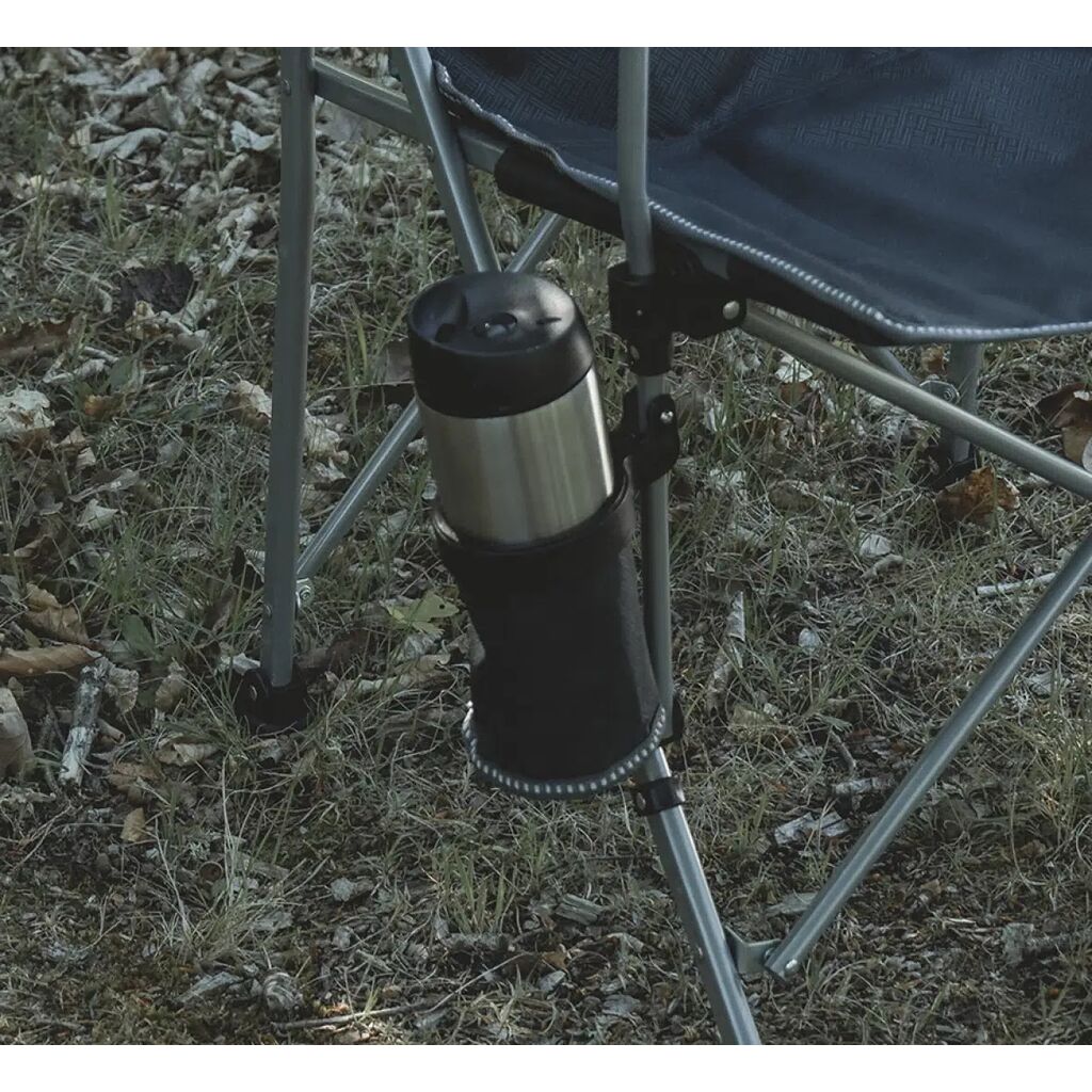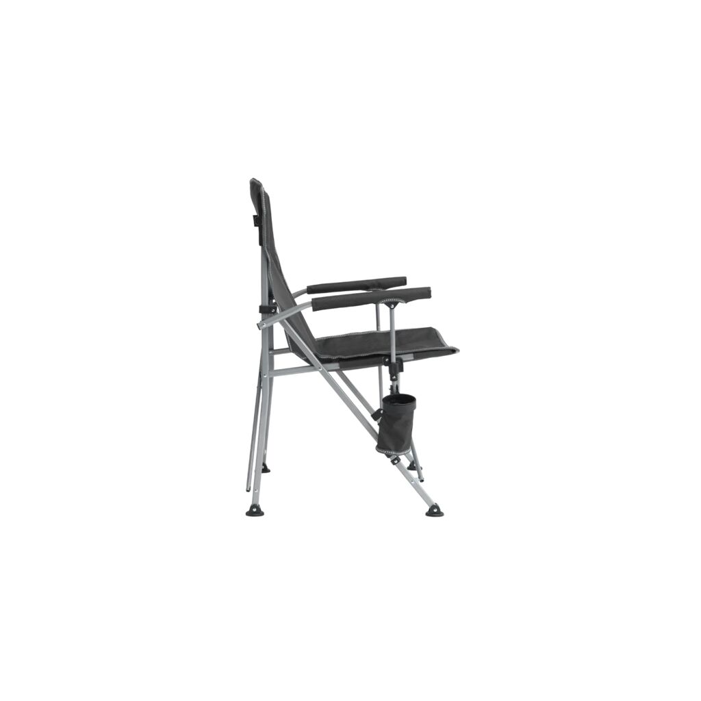 Compact in te pakken campingstoel met robuust stalen frame, gewatteerde armleuningen en bekerhouder. Draagt tot 110 kg.