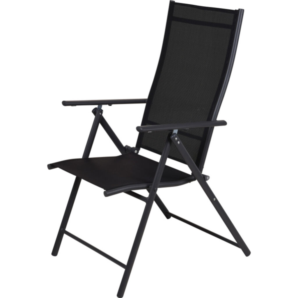 Betaalbare en opvouwbare campingstoel met armleuningen en zeven verschillende standen voor de rugleuning. Poedergecoat stalen frame en geweven polyester in de zitting en rugleuning zorgen voor een stabiele stoel met een maximale belasting van 120 kg.
