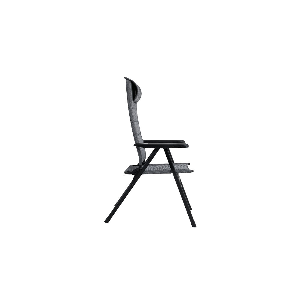 Stevige opvouwbare campingstoel met nekkussen en een extra brede, gevoerde zitting en een hoge rugleuning. De vulling is bedekt met Textline netstof en is snel drogend dankzij het waterafstotende materiaal eronder dat voorkomt dat de vulling water absorbeert. Dus het is geen probleem als het buiten in de regen blijft staan.