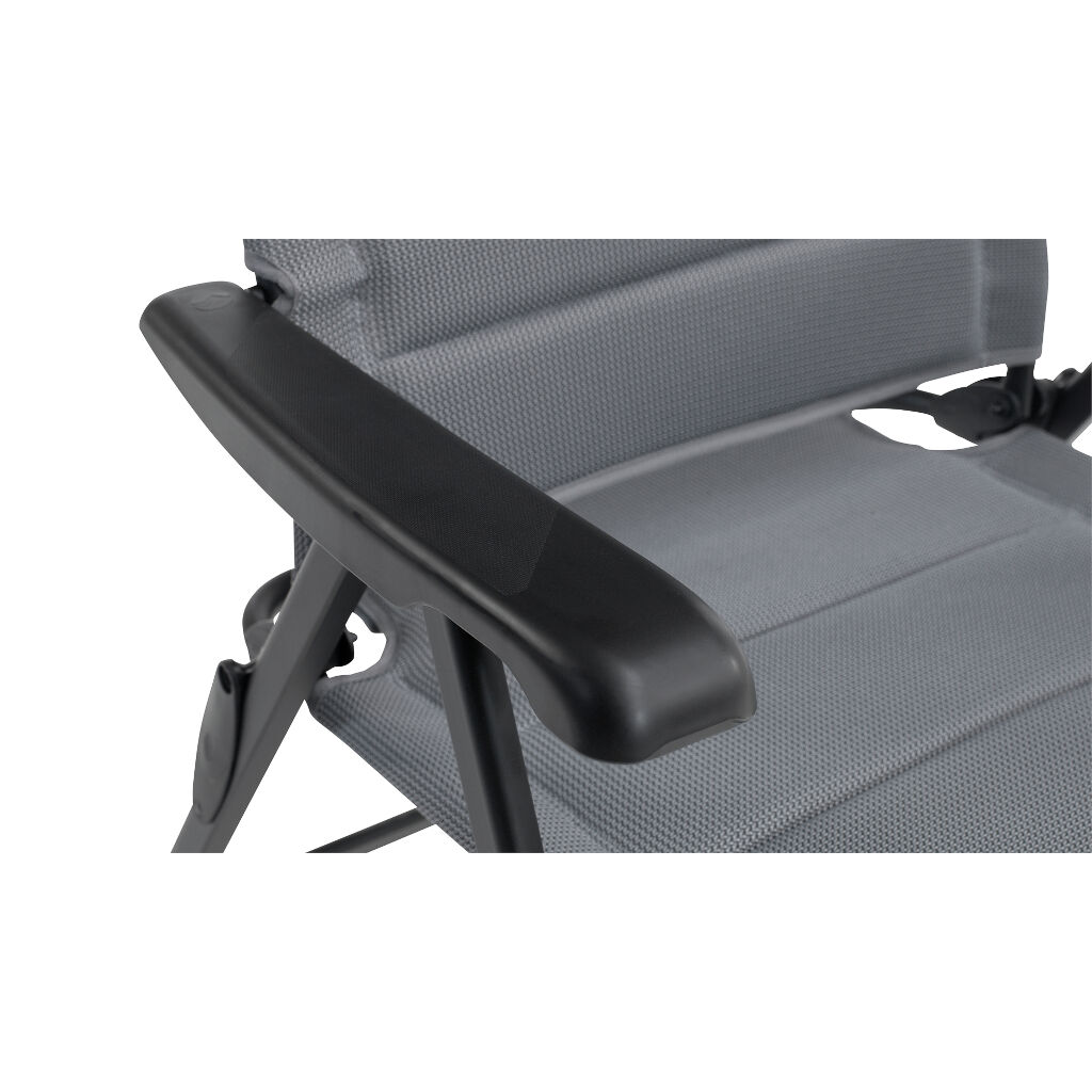 Extra brede campingstoel met sneldrogende vulling, rugleuning met 7 standen en gripvriendelijke armleuningen. De vulling biedt aanzienlijk meer comfort dan je krijgt bij gewone campingstoelen en dankzij een waterafstotend materiaal onder de stof dat voorkomt dat het schuim water opzuigt, is het geen probleem als de stoel in de regen wordt achtergelaten.