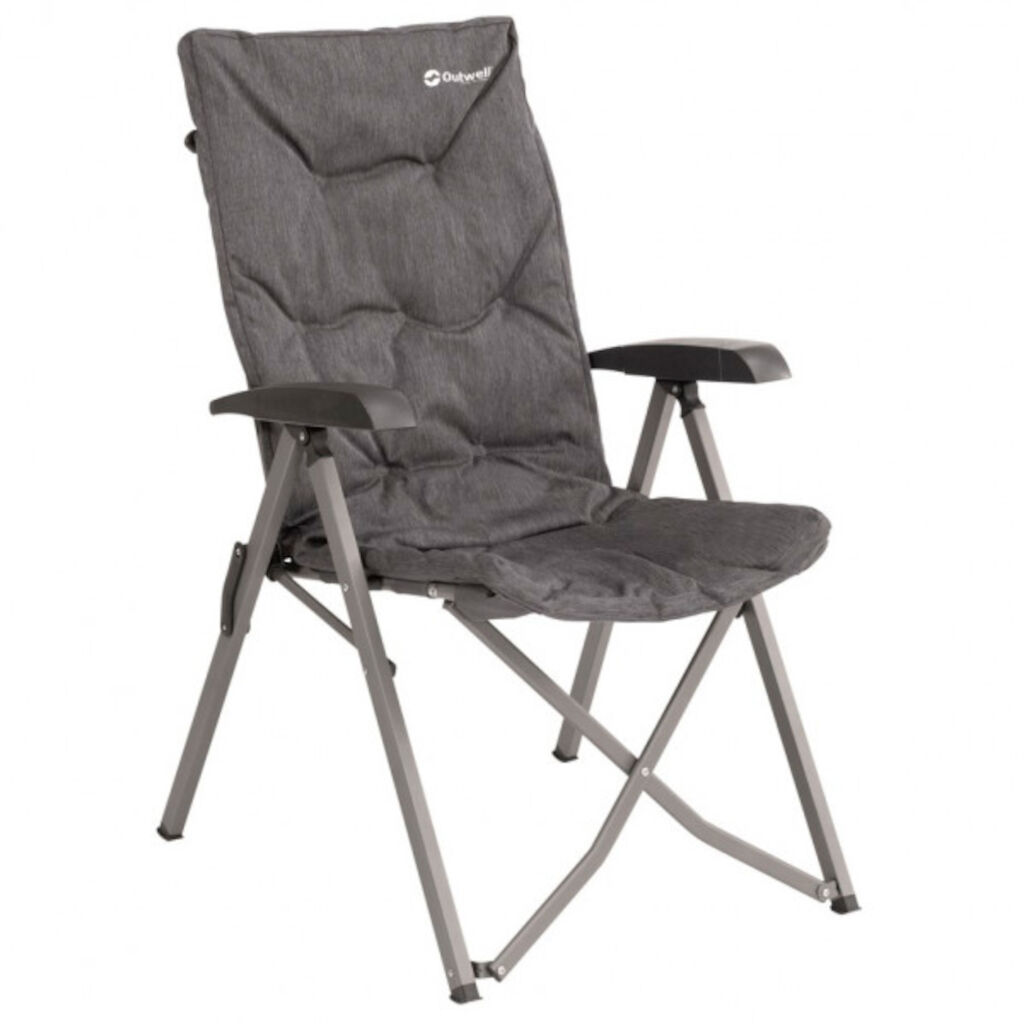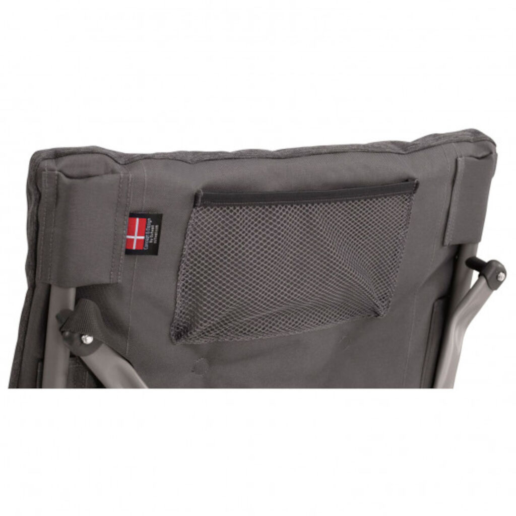 Een gevoerde stoel met vier standen voor zowel maaltijden als ontspanning. Voorzien van een hoge rugleuning voor goede neksteun, comfortabele armleuningen en een meshvak. Lichtgewicht, eenvoudig op te vouwen en geleverd met draagtas. Dikke vulling in zitting en rug voor goede isolatie en zacht zitcomfort.
