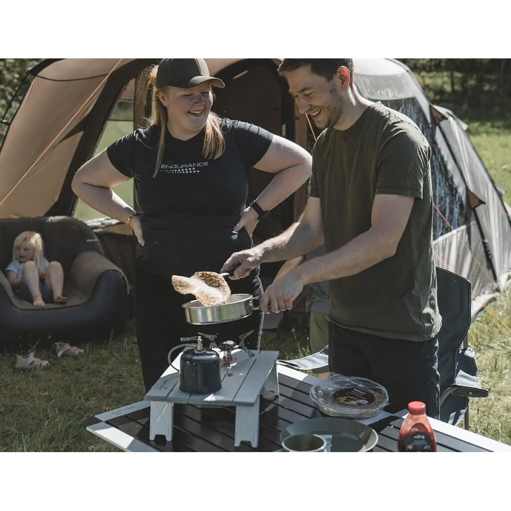 Opvouwbare tafel met een afneembaar tafelblad bestaande uit lamellen/platen die opgerold kunnen worden, waardoor de tafel een zeer klein pakformaat heeft. Perfect voor tentkamperen wanneer je alleen de auto hebt om in te pakken. Inclusief tas voor transport en opslag.