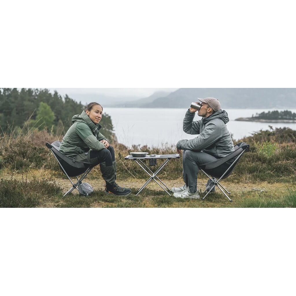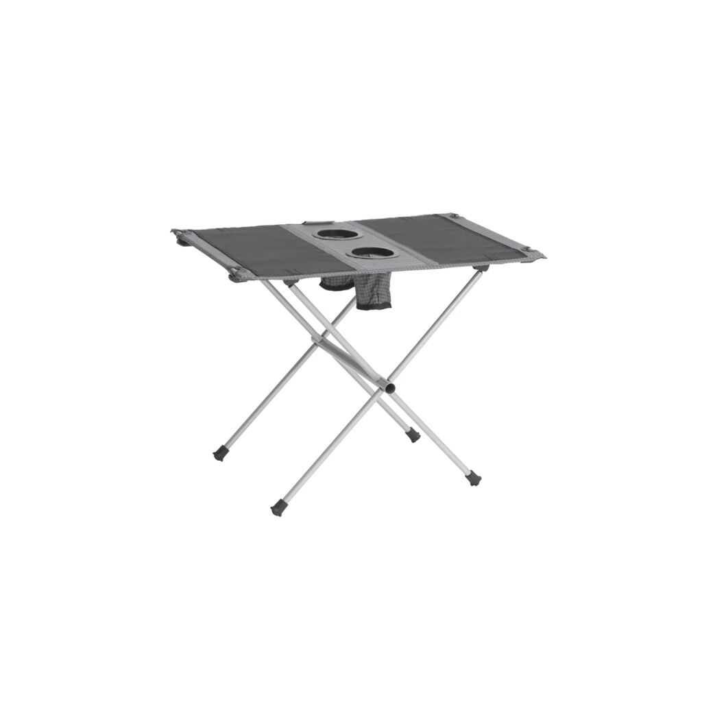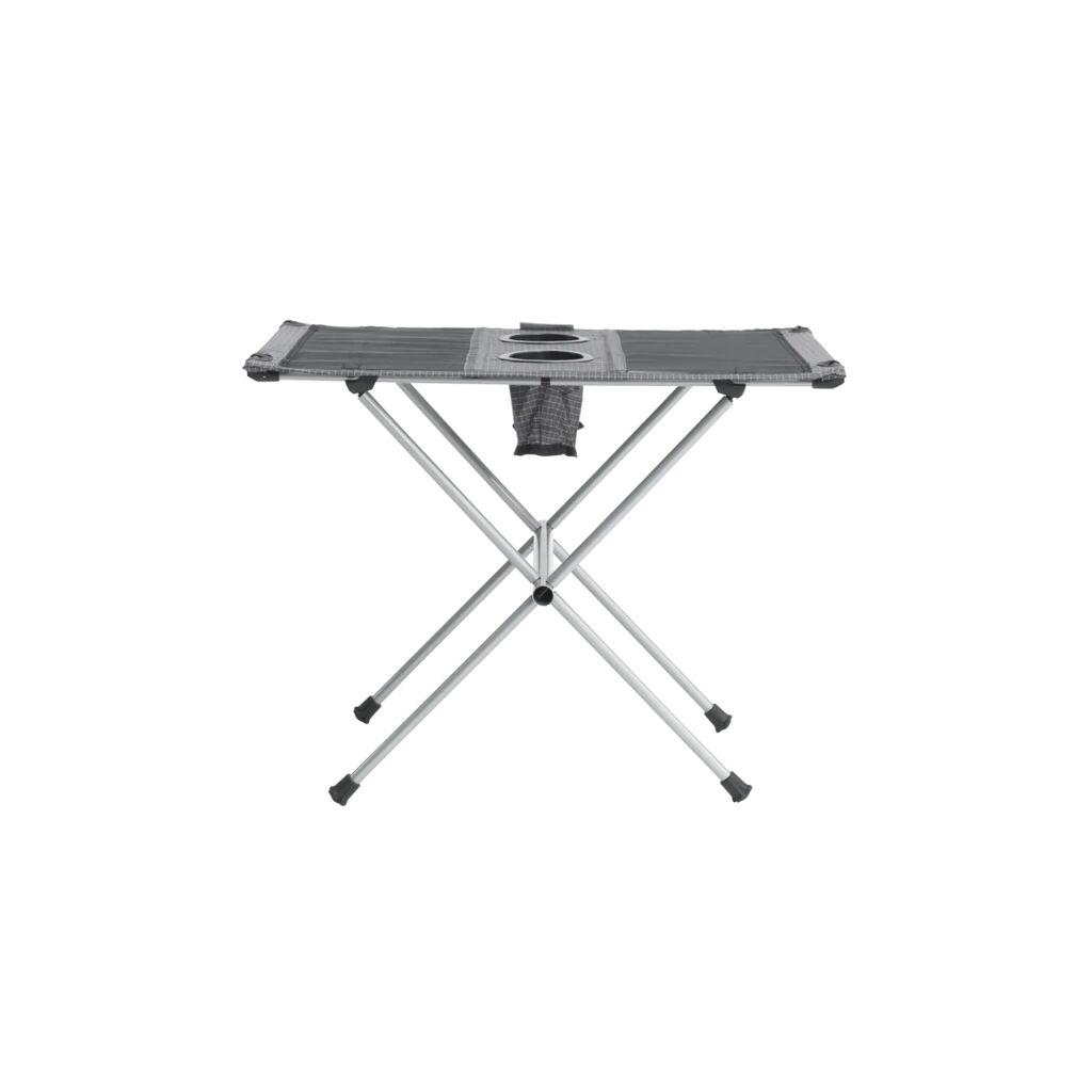 Kleine en lage tafel met stalen frame en bekerhouders voor twee personen. Perfect voor een kleine tent, dagtochten, het strand of picknicks, omdat je er ook goed zittend op de grond aan kunt eten. Compact pakformaat en eenvoudig in te klappen en op te bergen in de meegeleverde draagtas.