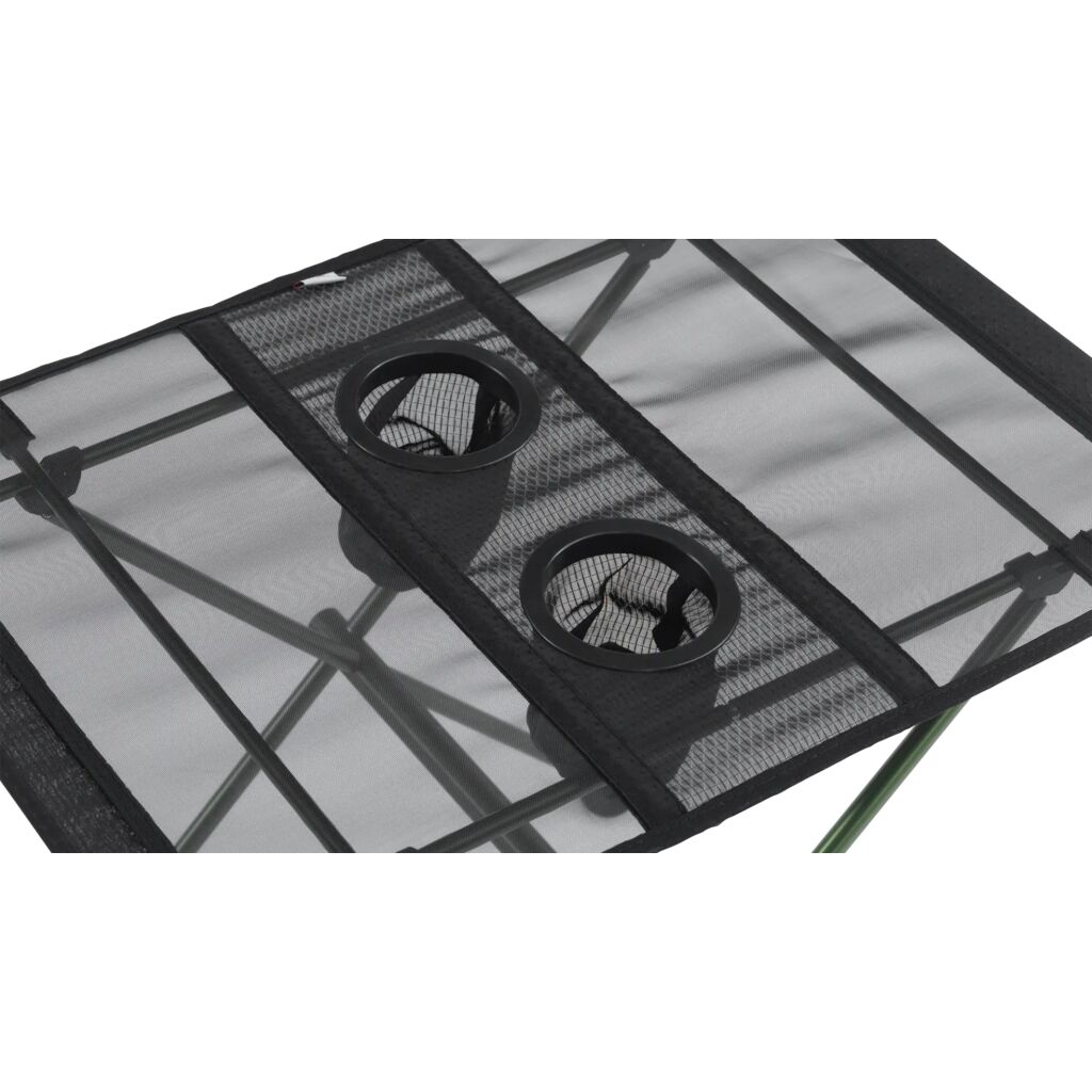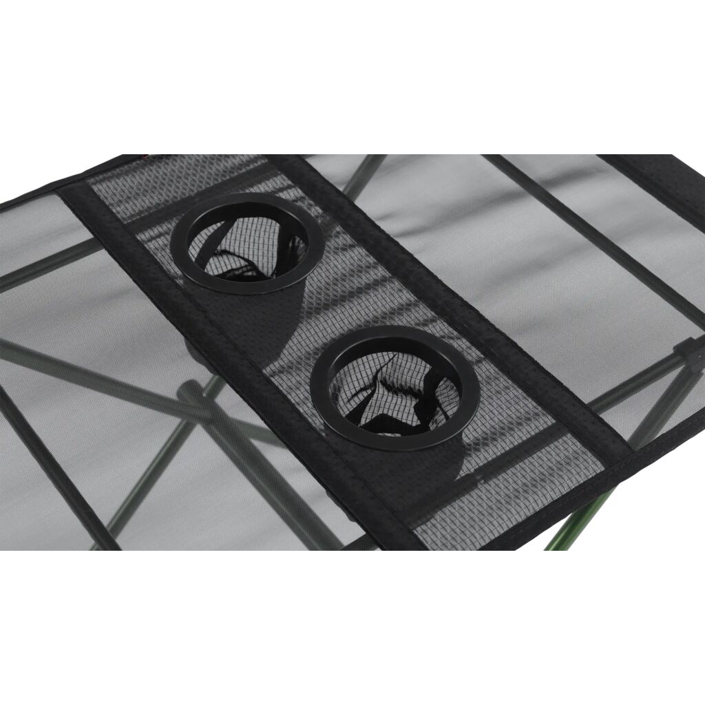 Kleine en lichte tafel met een aluminium frame, een tafelblad van mesh en twee geïntegreerde bekerhouders. Compact pakformaat en eenvoudig op te vouwen en op te bergen in de meegeleverde draagtas.
