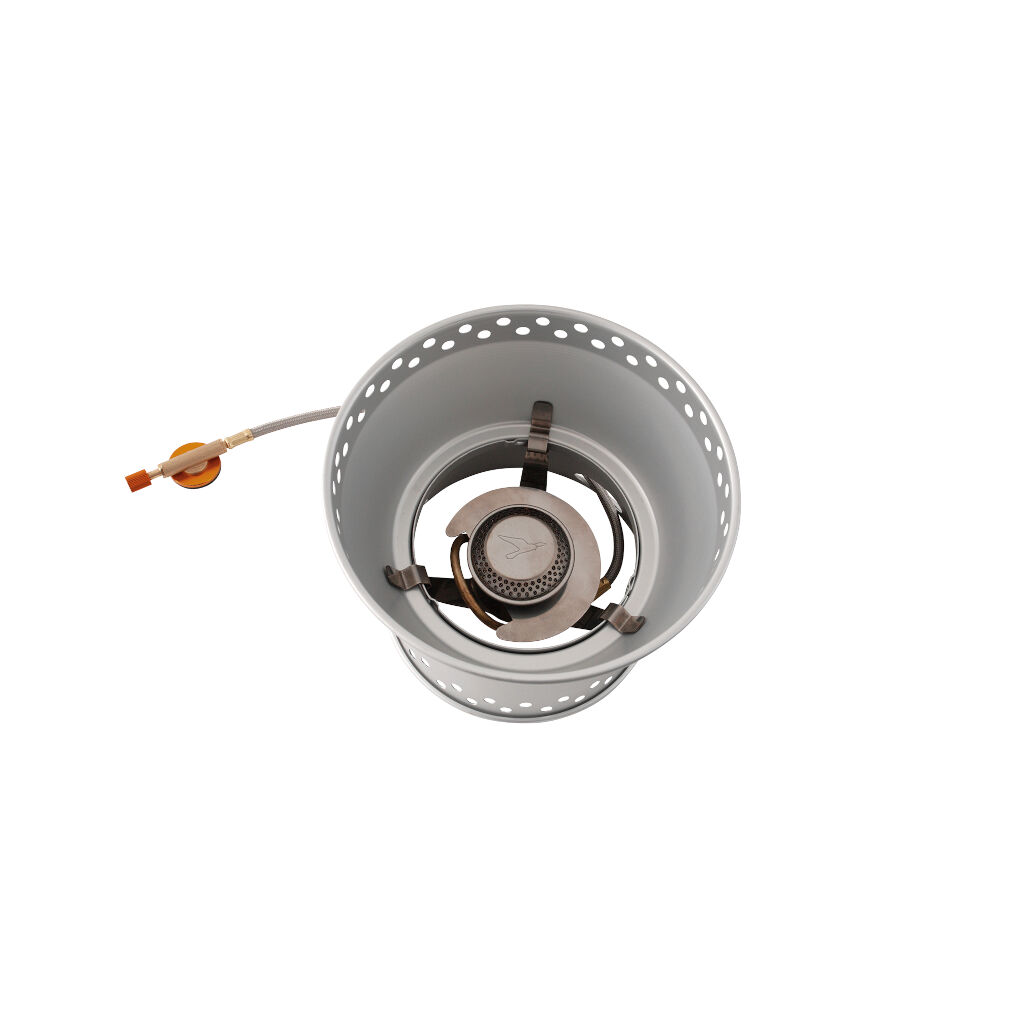 Stormkeuken van aluminium met een gasbrander van roestvrij staal met voorverwarmingssysteem. De keuken wordt geleverd met 2 pannen (1,3 L en 1,5 L), 1 koekenpan/bord van 20,5 cm en 1 handvat. De brede basis van de keuken zorgt voor stabiliteit en de bescherming voor de brander biedt goede weerstand tegen wind.