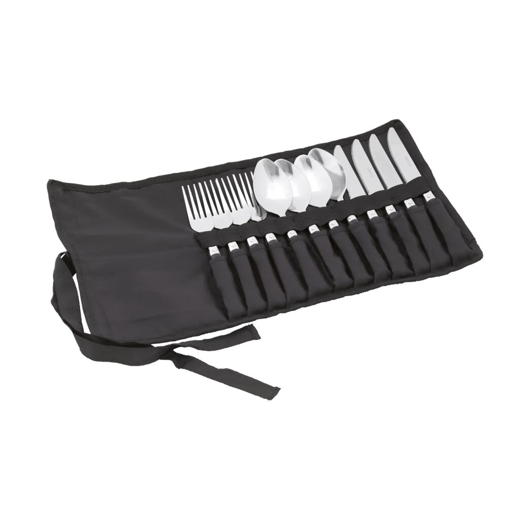 Bestekset voor 4 personen met messen, vorken en lepels in een praktische opbergtas.