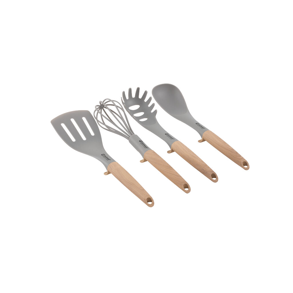 Keukengerei voor kamperen. De set bevat een pastalepel, garde, spatel en serveerlepel. De gereedschappen kunnen eenvoudig worden opgeborgen in de meegeleverde netzak.