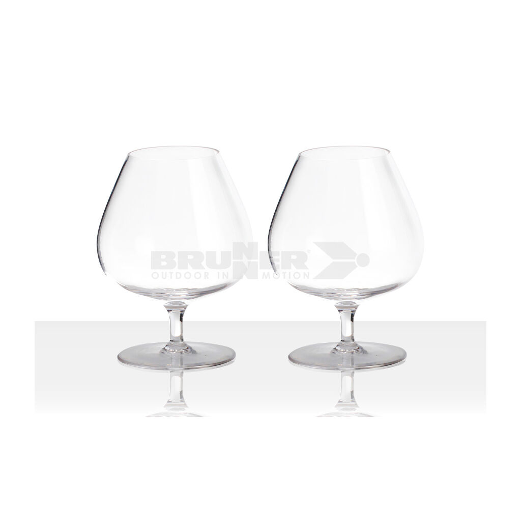 Elegante cognacglazen van Brunner, gemaakt van onbreekbaar Tritan-plastic, ontworpen voor kamperen en buitenleven.