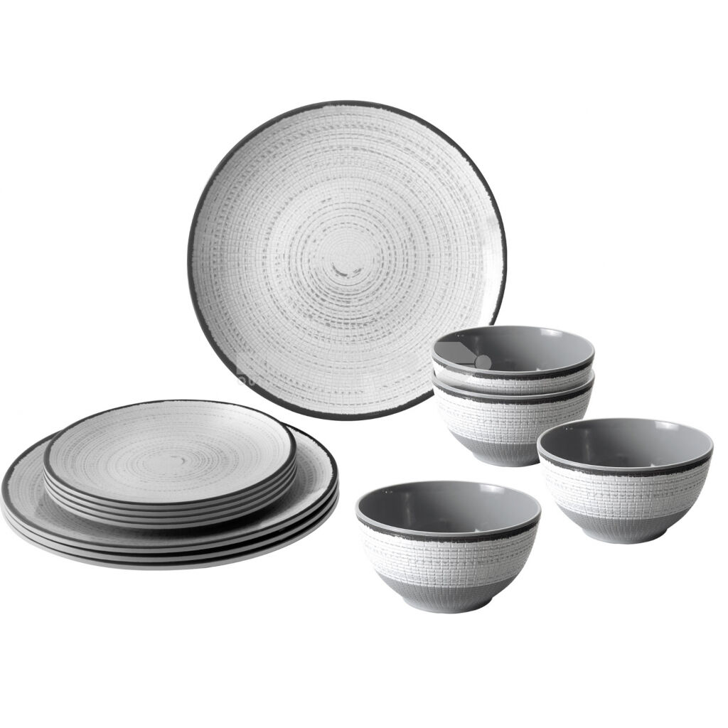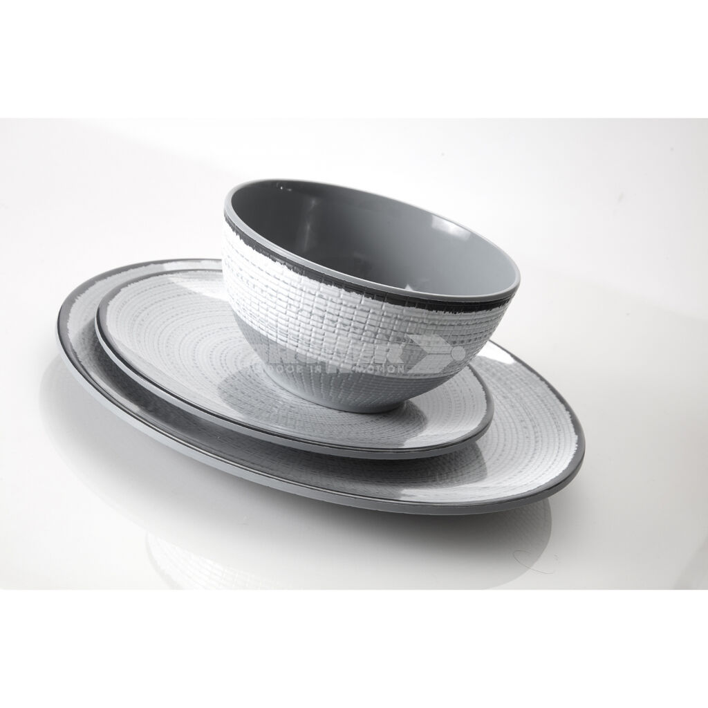 Servies voor vier personen in melamine met anti-slip aan de onderkant. Licht en duurzaam maakt het zeer geschikt voor kamperen.