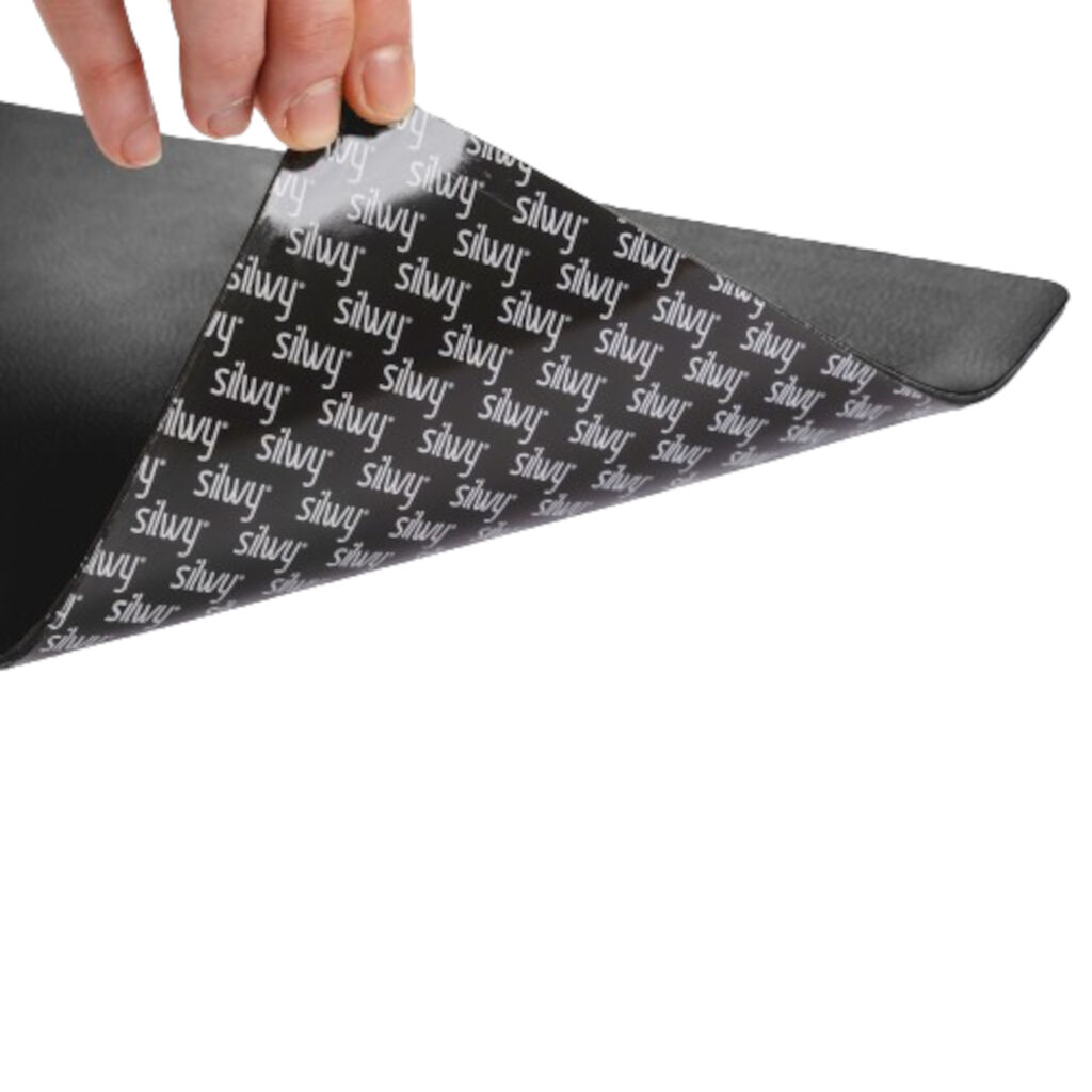 Magnetische placemat die is aangepast voor Silwys glazen, mokken en borden. De placemat bestaat uit een oppervlak dat op leer lijkt en een kleverige onderkant die op alle oppervlakken kan worden bevestigd zonder resten achter te laten. Als de kleefkracht afneemt, kan deze worden geactiveerd door af te spoelen met water.