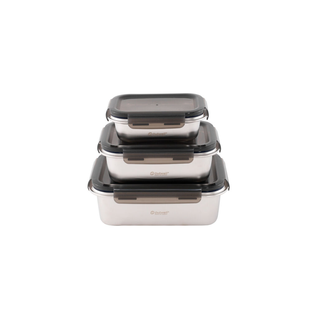 RVS lunchboxen en deksels van siliconen in verschillende maten. Perfect voor het bewaren, verwarmen of invriezen van voedsel tijdens uw kampeerreis.