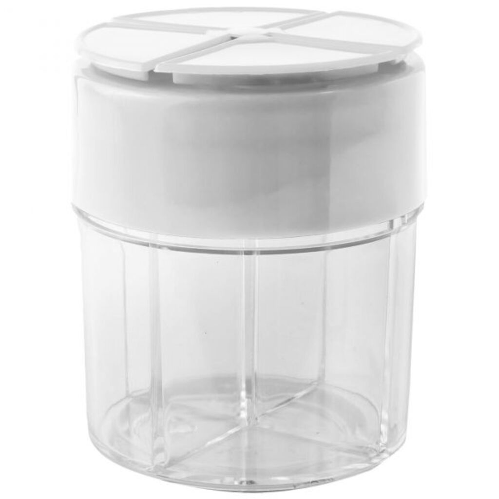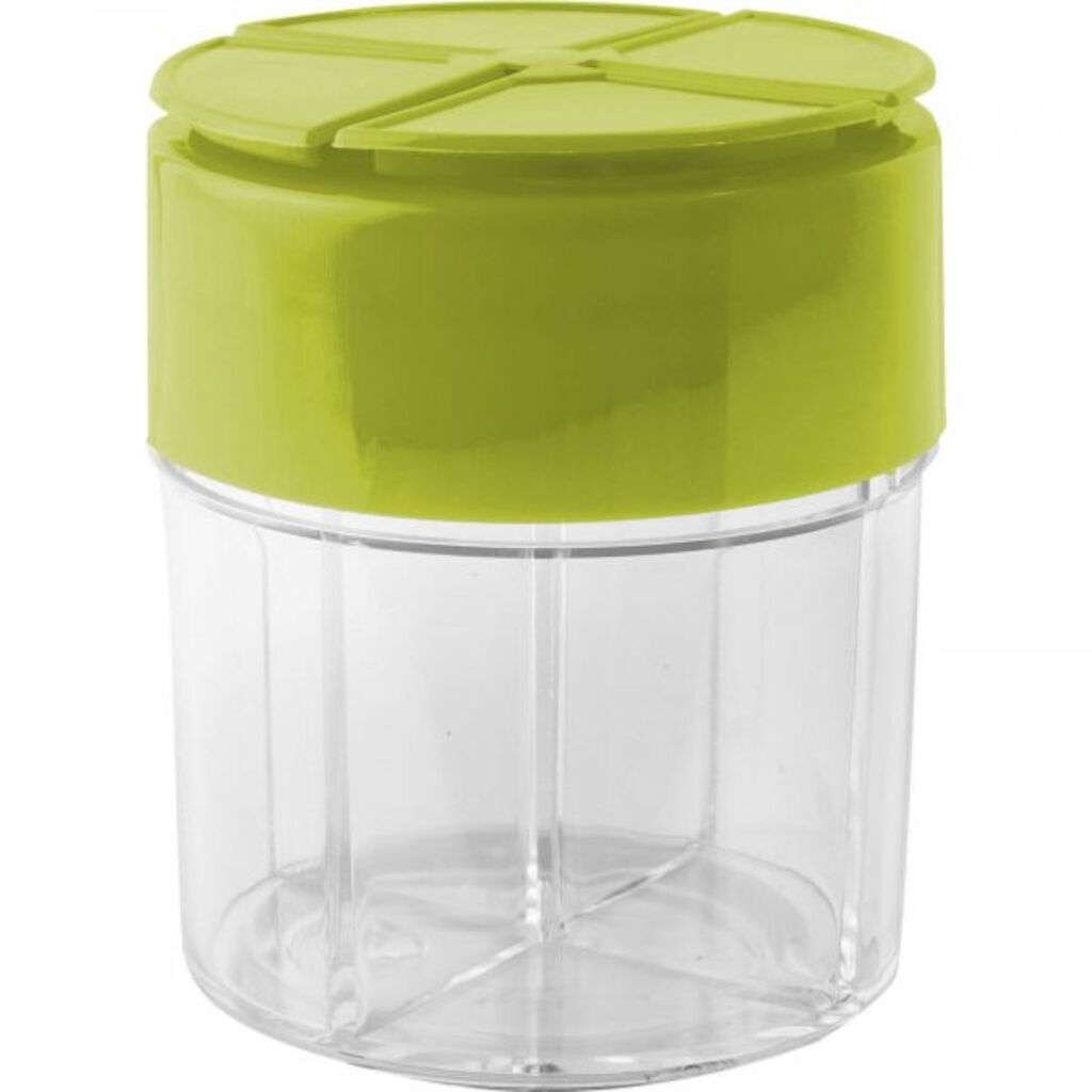 Praktische opslag voor kruiden tijdens het kamperen. Gemaakt van hoogwaardig kunststof met vier aparte vakken van elk 50 ml. Het deksel sluit goed af, zodat er geen lucht of kruiden in- of uitlekken.