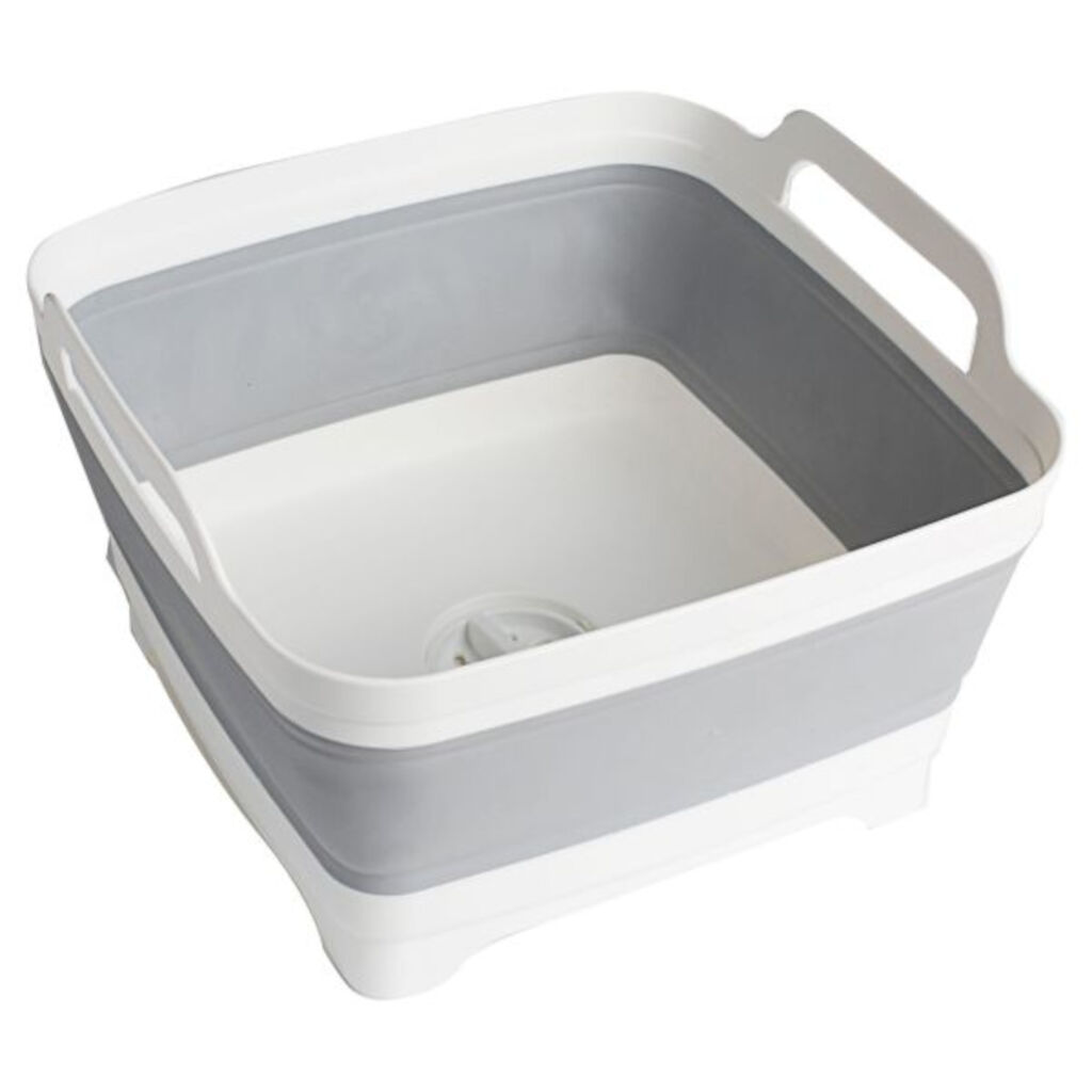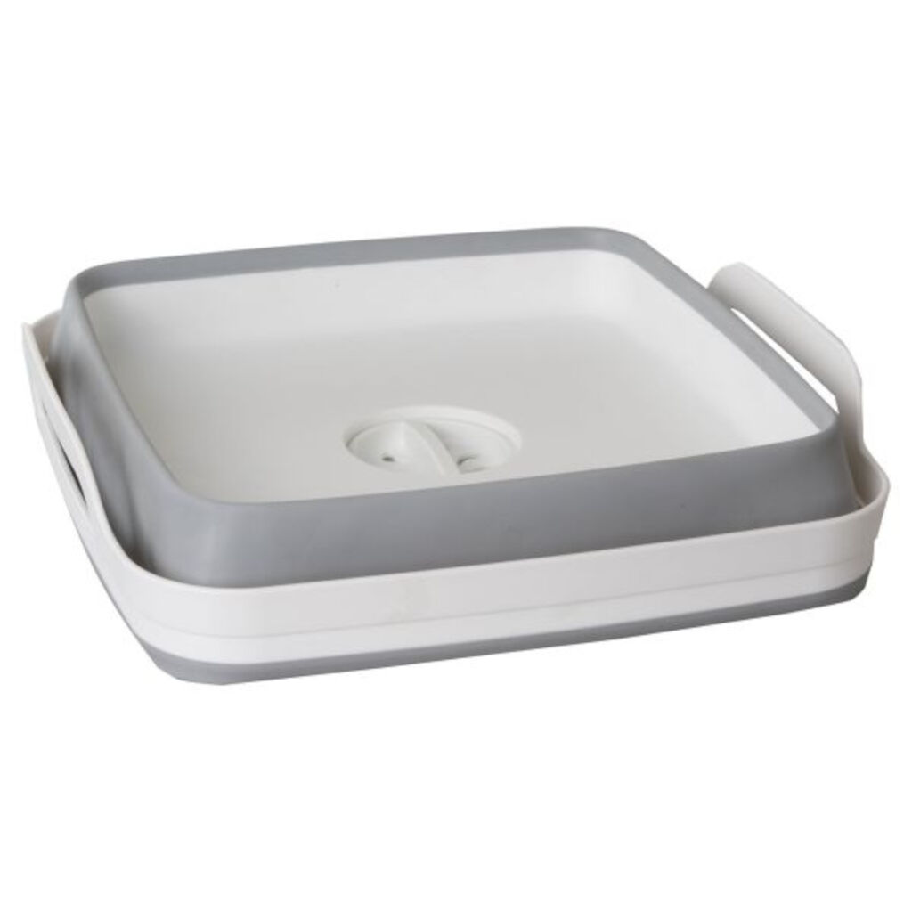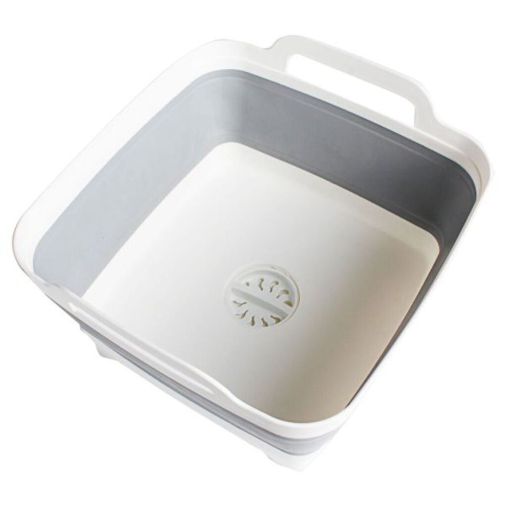 Handige opvouwbare gootsteen met ingebouwde afvoer met stop. Wanneer deze niet wordt gebruikt, wordt hij samengedrukt en is slechts 7,5 cm hoog, wat hem gemakkelijk mee te nemen maakt op de kampeertocht.
