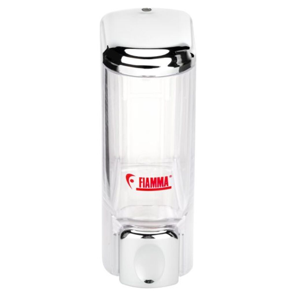 Container van Fiamma voor zeep of shampoo met een inhoud van 200 ml. Ideaal voor kamperen, caravans en campers omdat hij weinig ruimte inneemt. Kan worden vastgeschroefd of vastgeplakt. (Tape inbegrepen)
