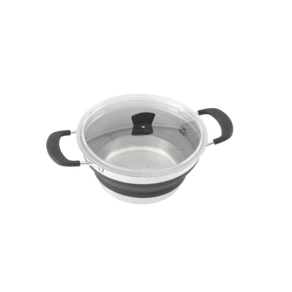 Opvouwbare pan gemaakt van roestvrij staal en gesiliconiseerd rubber dat hittebestendig is, gemakkelijk schoon te maken en zijn vorm behoudt, zelfs bij hoge temperaturen. Perfect voor degenen die de bagage willen minimaliseren.