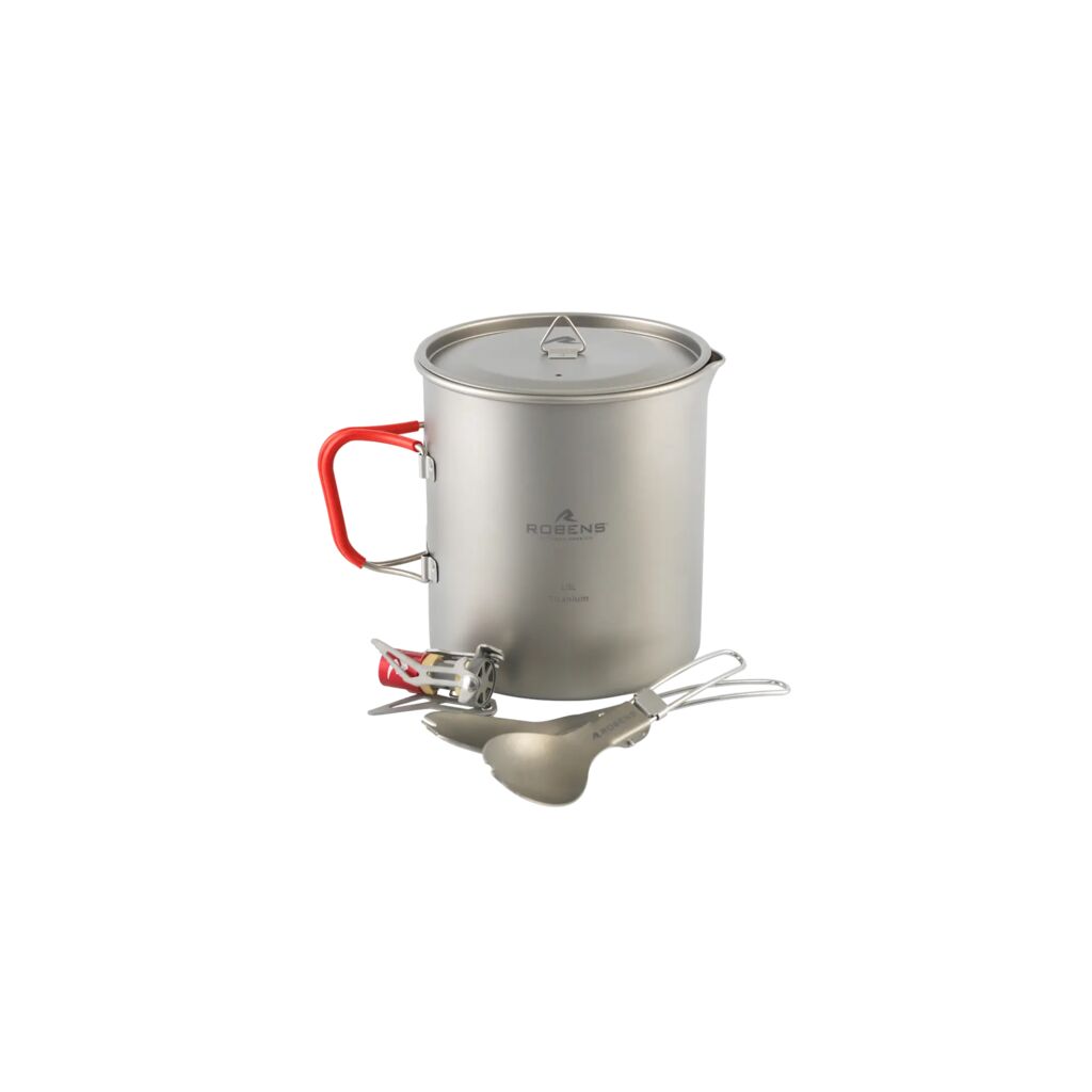 Compact kookset van lichtgewicht titanium voor twee personen. De set bevat een pan met deksel, twee sporks en een gasbrander die direct op de gaspatroon wordt bevestigd. Ontworpen om een gaspatroon van 100 g of 230 g in de pan te passen wanneer de set is ingepakt.