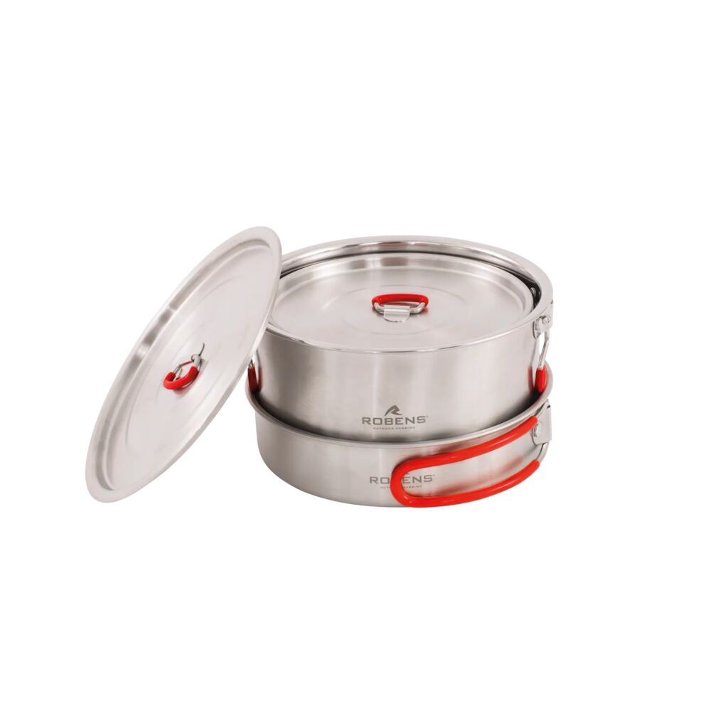 Een praktische en hoogwaardige kookset van Robens voor koken op een campingkooktoestel. Handgrepen van roestvrij staal met siliconen coating en pannen die krasbestendig en hittebestendig zijn.
