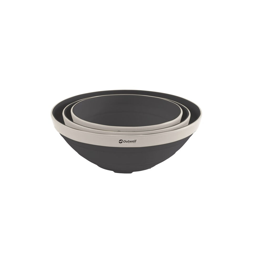 Komset voor kamperen en buitenactiviteiten. Drie inklapbare kommen om salade, snacks of eten te serveren. Moet niet gebruikt worden voor echt warm eten.