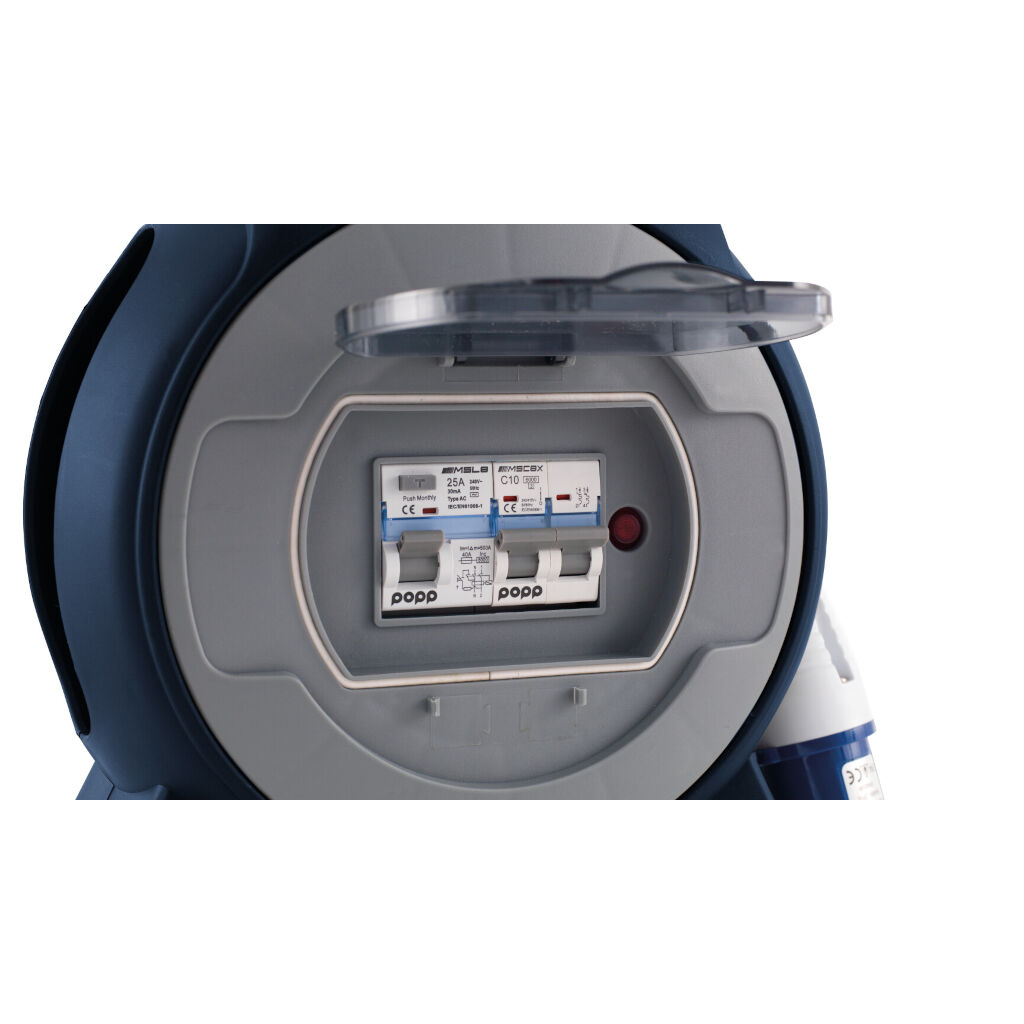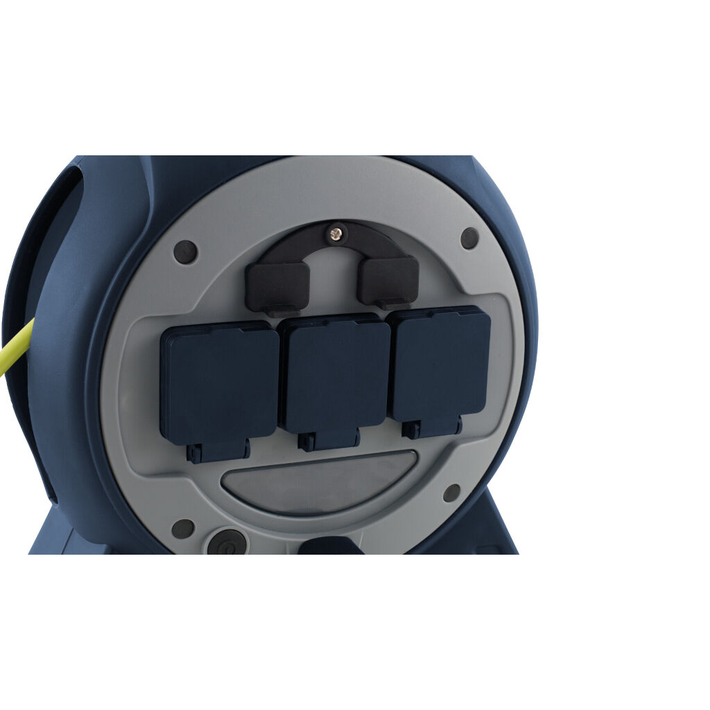 Kabelhaspel met drie stopcontacten voor 230V, twee USB-poorten en een 15 m kabel. CEE-stekker (2 polen + aarde) voor aansluiting. Ingebouwde LED-verlichting.