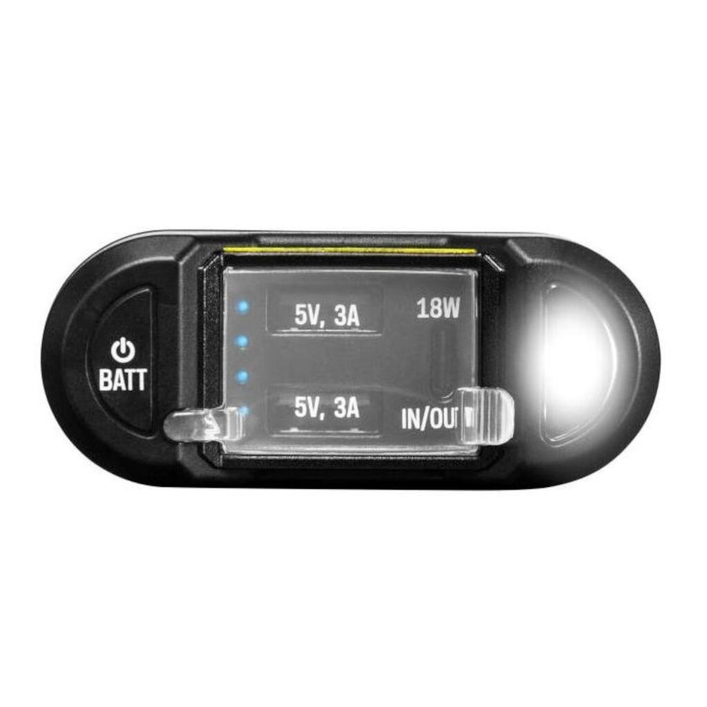 Laad hem thuis of in de auto op via een 2,4A USB (4 uur) of 18W USB-C-uitgang (3 uur)