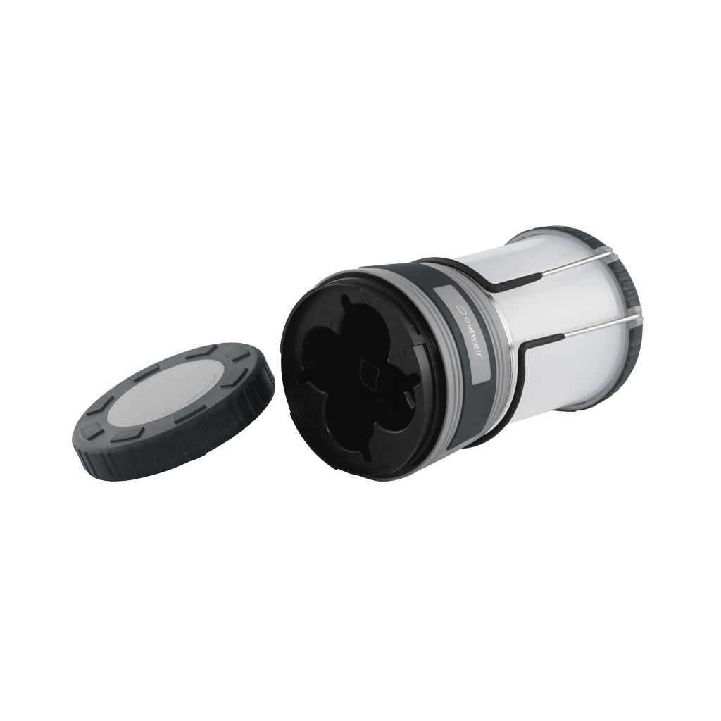 Heldere campinglamp met draaghendel. Dankzij de haak aan de onderkant en de afneembare bovenkant kan hij in de tent als plafondlamp worden gebruikt. Werkt op 4 D-batterijen (niet inbegrepen).