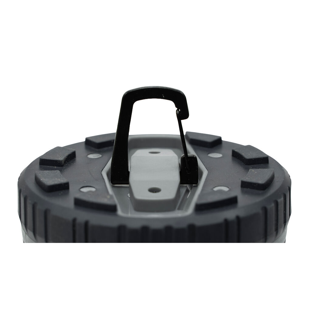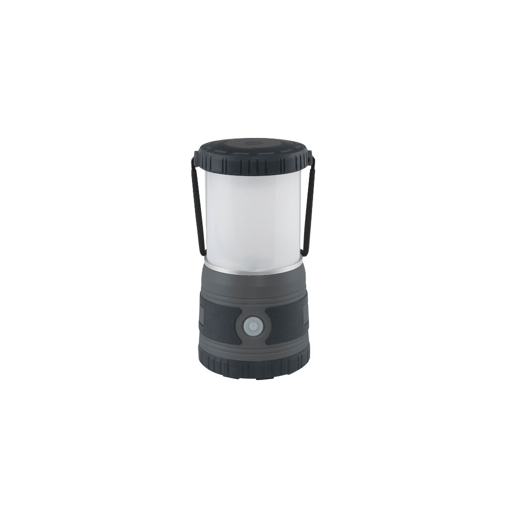 Heldere campinglamp met draaghendel. Dankzij de haak aan de onderzijde en de afneembare bovenkant kan hij ook als plafondlamp in de tent worden gebruikt.