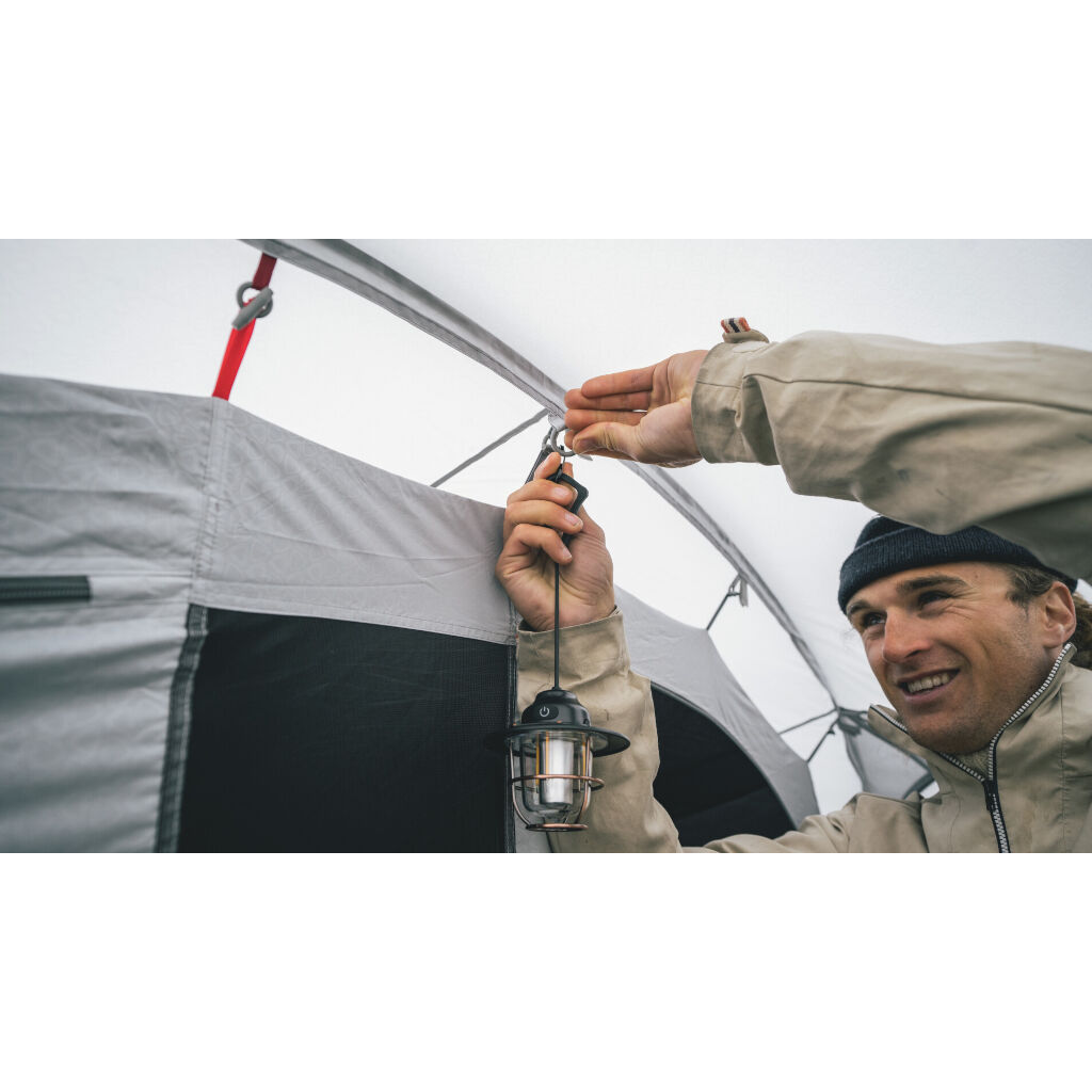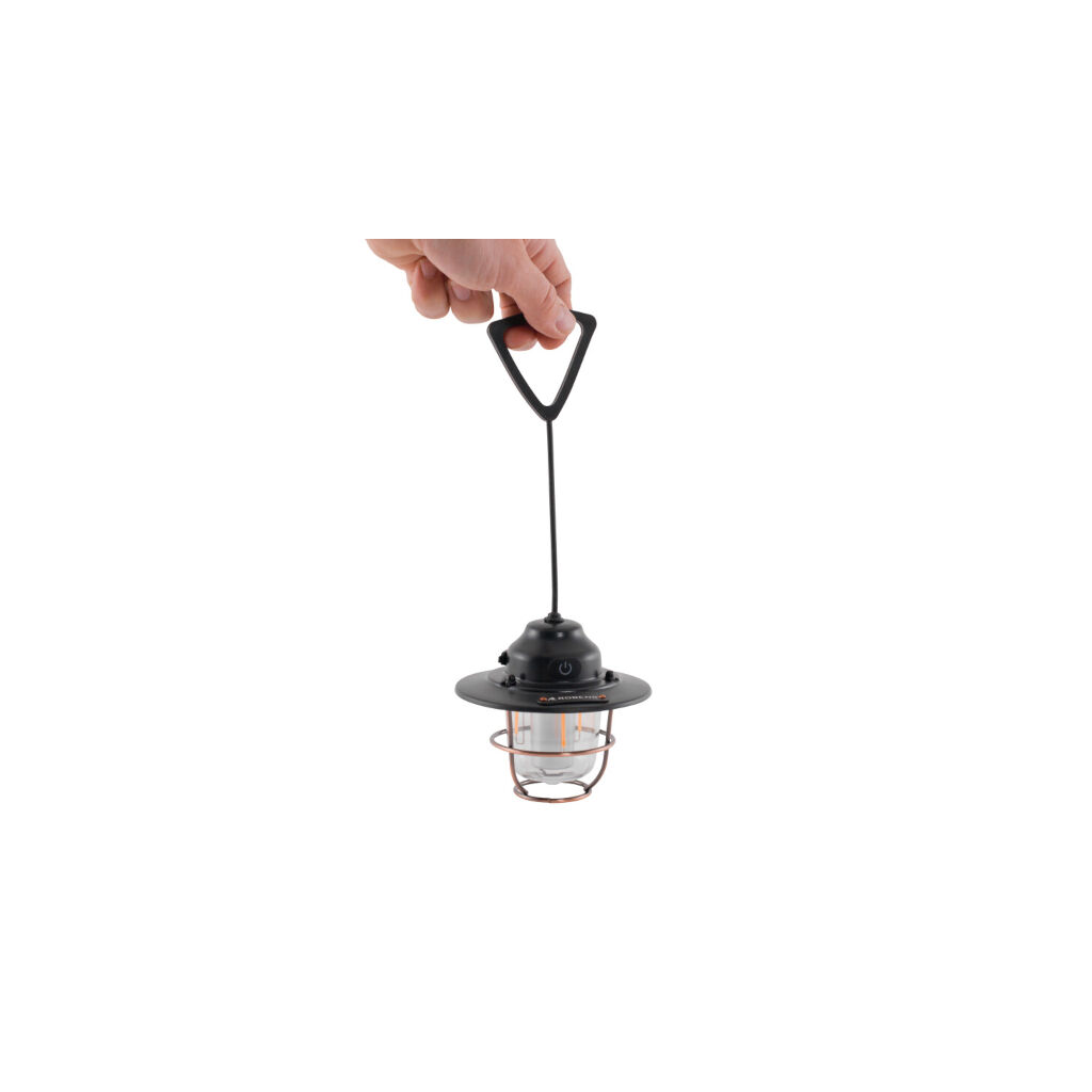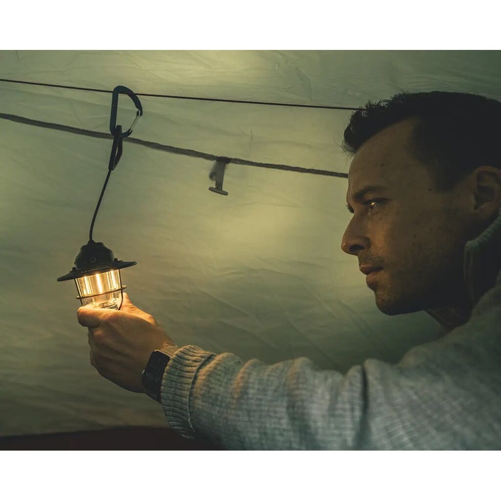 Compacte en praktische campinglamp in klassiek ontwerp met moderne functies. De lamp heeft een oplaadbare batterij, dimmerfunctie en meerdere kleuropties. Wordt geleverd met karabijnhaak voor eenvoudige ophanging en oplaadkabel (USB-C).