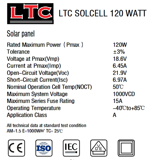 Een flexibel 120W zonnepaneel van LTC. 30% hogere efficiëntie vergeleken met conventionele zonnepanelen. Het zonnepaneel heeft een vermogensgarantie van 90% gedurende de eerste 10 jaar en daarna minimaal 80% in 25 jaar. Het zonnepaneel bestaat uit monokristallijn, wat zorgt voor een hogere efficiëntie in vergelijking met polykristallijne zonnepanelen.
