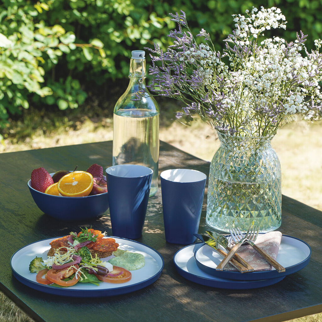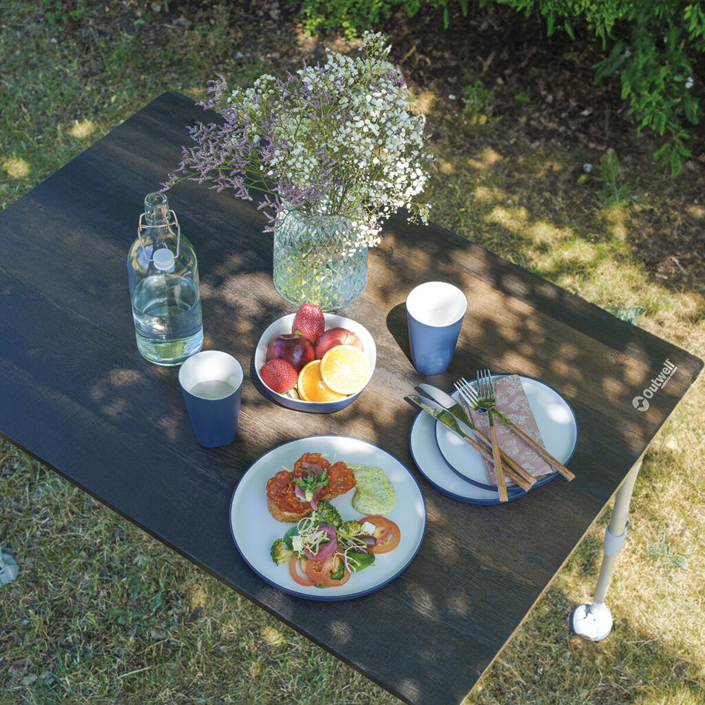 Dinerset voor 4 personen dat kan worden gestapeld tot een klein en handig formaat, perfect voor de kampeerreis.