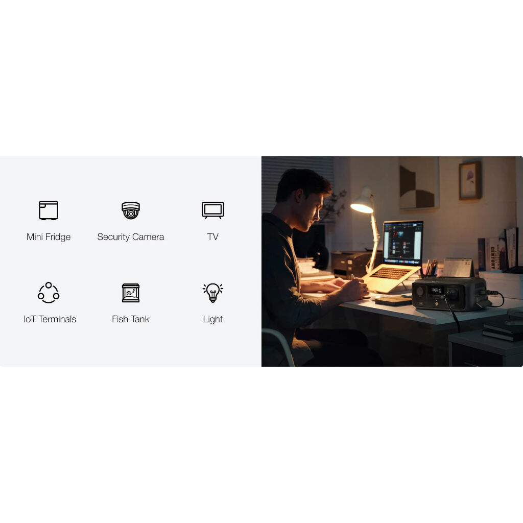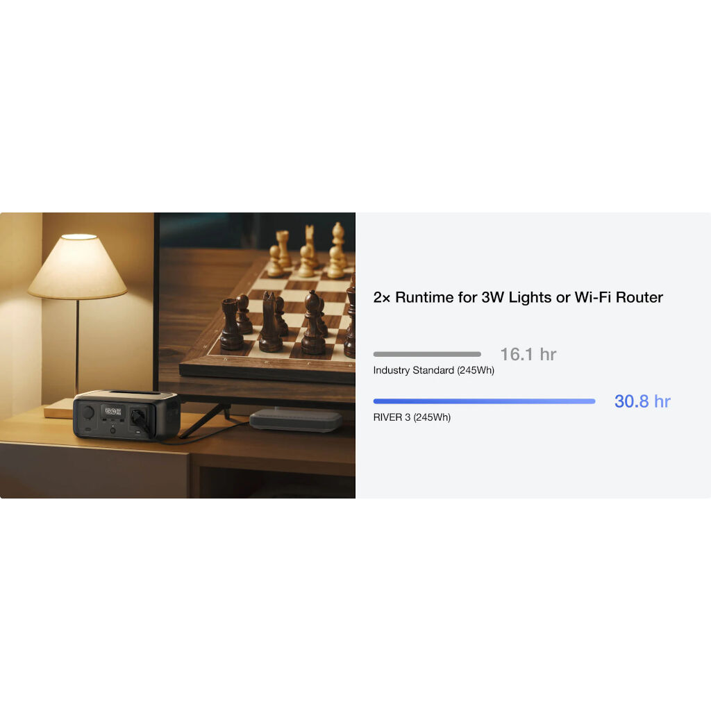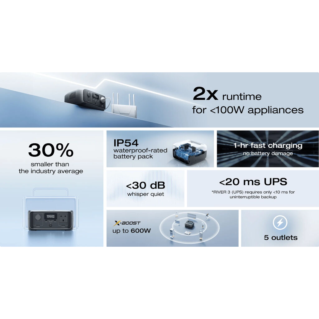 LET OP: EcoFlow River 3 is verkrijgbaar in twee versies: een standaardversie en een met UPS, wat betekent dat hij tussen het stopcontact en het apparaat kan worden aangesloten en automatisch overneemt als de stroom uitvalt. Perfect voor bijvoorbeeld computers, bewakingscamera's, enz.