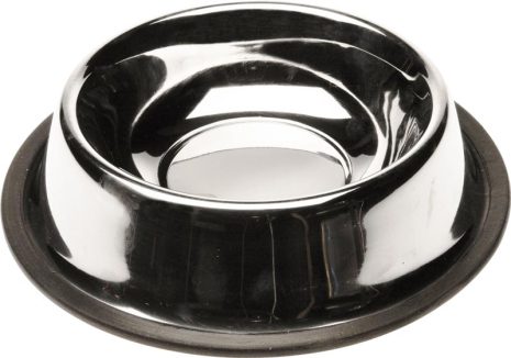 Grotere voer- of waterbak in duurzaam roestvrij staal met rubberen ring aan de onderkant voor stabiliteit.