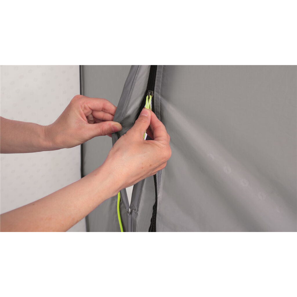 Snel op te zetten dubbele douche-/toilettent van het Deense merk Outwell. De tent is ontworpen als een draagbare badkamer voor kampeerders die een eigen toilet, douche en kleedruimte willen. Geïntegreerde vloer met afwatering biedt een comfortabelere douche-ervaring en houdt je voeten vrij van zand en vuil. Royale ventilatie in het dak met een plank voor een zonnedouche. Een slim detail is een dakvensterpaneel dat zonlicht toelaat om het water in de zonnedouche te verwarmen. Er is ook een deur tussen de twee secties met een magneetstrip, waardoor het eenvoudig is om tussen beide te bewegen, bijvoorbeeld tijdens douchen en omkleden.