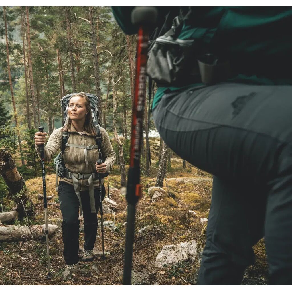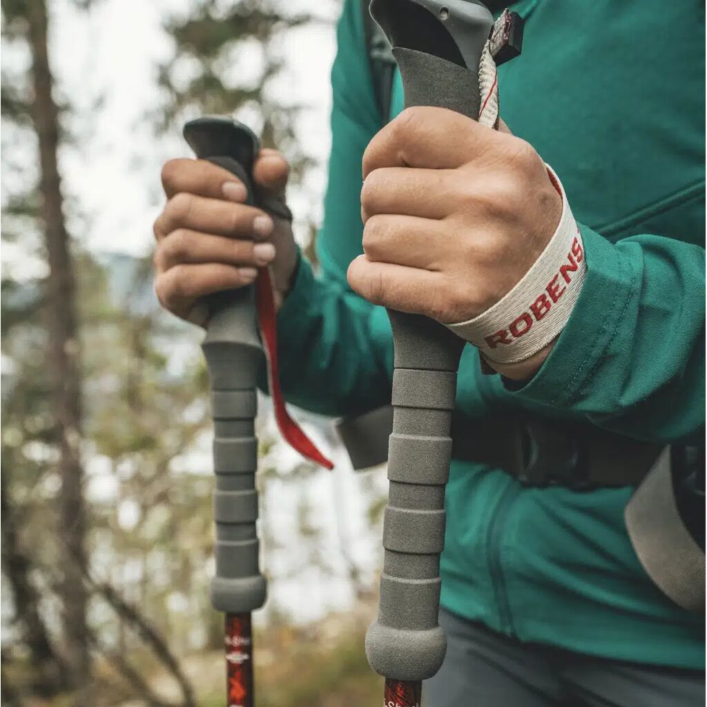 Telescoop wandelstokken van aluminium met vering (antischoksysteem). Het antischoksysteem is eenvoudig aan en uit te schakelen door aan het bovenste deel van de stok te draaien en bestaat uit een veeroplossing op het bovenstuk die een zachtere belasting biedt bij langere wandelingen. De stok heeft extra lange handgrepen om de grip aan te passen aan het terrein. Punt aan de onderkant wat goede grip biedt. De klauwen zijn vervangbaar.