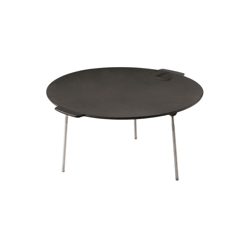 Gietijzeren bakplaat voor koken boven open vuur. Koken met de Bighorn zorgt ervoor dat het hele gezin of de groep zich rond de bakplaat kan verzamelen en samen kan koken.
