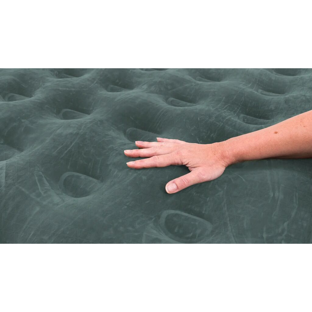 Extra brede opblaasbare matras/tentbed voor twee personen met extra gestabiliseerde randen en een zachte velours aan de bovenkant wat het zeer comfortabel maakt om op te liggen. Door een dubbelwerkende ventiel wordt de matras snel opgeblazen en snel geleegd. Geschikt voor zowel de campingvakantie als een extra bed thuis.