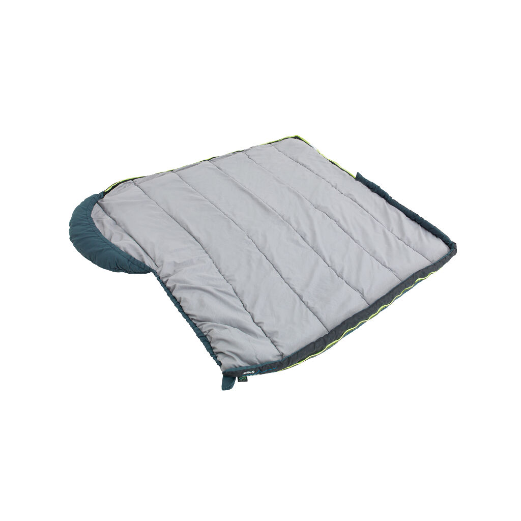Kinderslaapzak geschikt voor het hele tentkampeerseizoen. De slaapzak heeft een dubbele laag vulling, een aantrekbare capuchon en een rits met een beschermende flap die beschermt tegen tocht. De rits kan volledig geopend worden zodat de slaapzak als deken gebruikt kan worden, en kan ook aan het voeteneind geopend worden om de temperatuur in de slaapzak te verlagen tijdens warmere nachten.