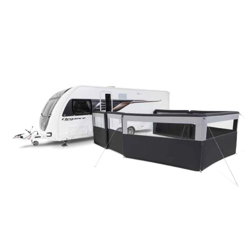 Windscherm met luchtkanalen van 11,4 meter. Het windscherm wordt opgepompt vanaf één punt en kan worden gekoppeld aan meer windschermen van Dometic of worden aangesloten op uw Dometic voortent. Een compleet frame geeft het windscherm een goede stabiliteit. Sterke stormlijnen bieden extra bescherming bij sterkere wind.