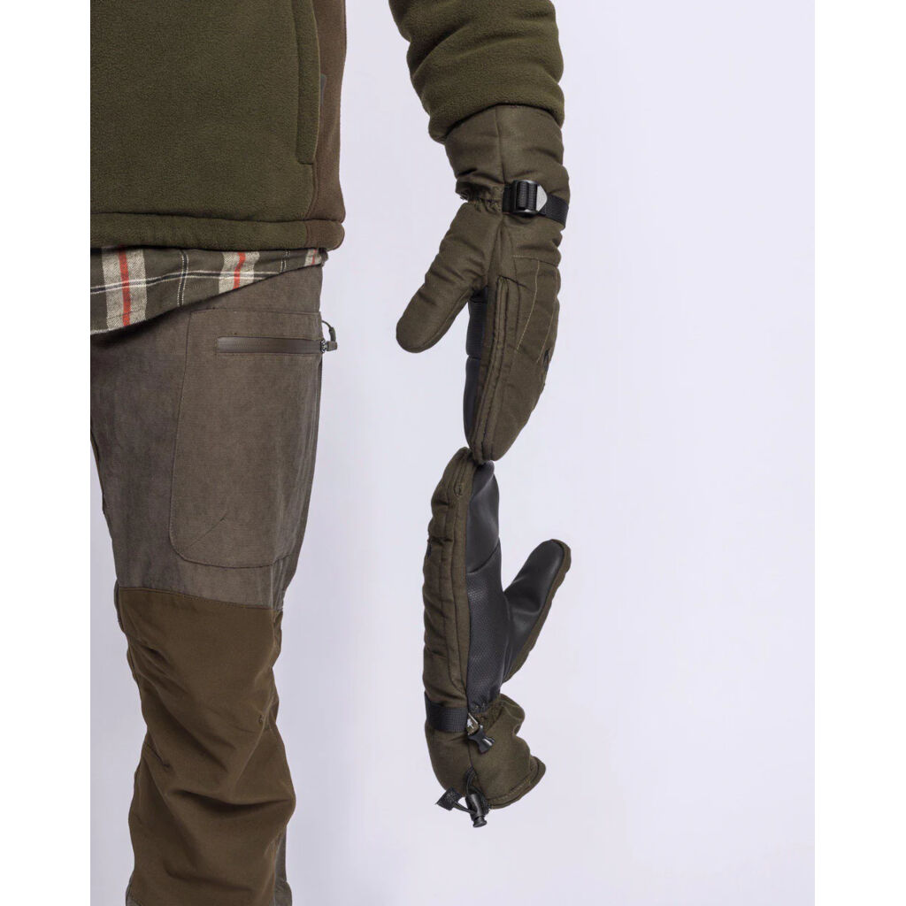 Vattenavvisande handske med magnetlist fram för att enkelt kunna öppna och stänga smidigt. Perfekt vid jakten eller fisket. Gummerad greppyta och värmande foder gör att den passar för vinterväder. Vanten har ett justerbart band och dragsko kring handleden för att anpassa passformen.