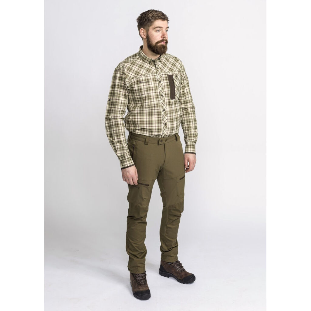 Comfortabele en duurzame outdoorbroeken van Pinewood. Stretchpanelen aan de voorkant van de dijen en de achterkant van de dijen tot aan de kuiten maken ze flexibel en comfortabel. Versterkte delen met een gewaxt en waterafstotend oppervlak van technische katoen aan de voorkant van de dijen, achterkant van de kuiten en in het zitvlak. Perfect voor wandelen, jagen, vissen en dagelijks gebruik.