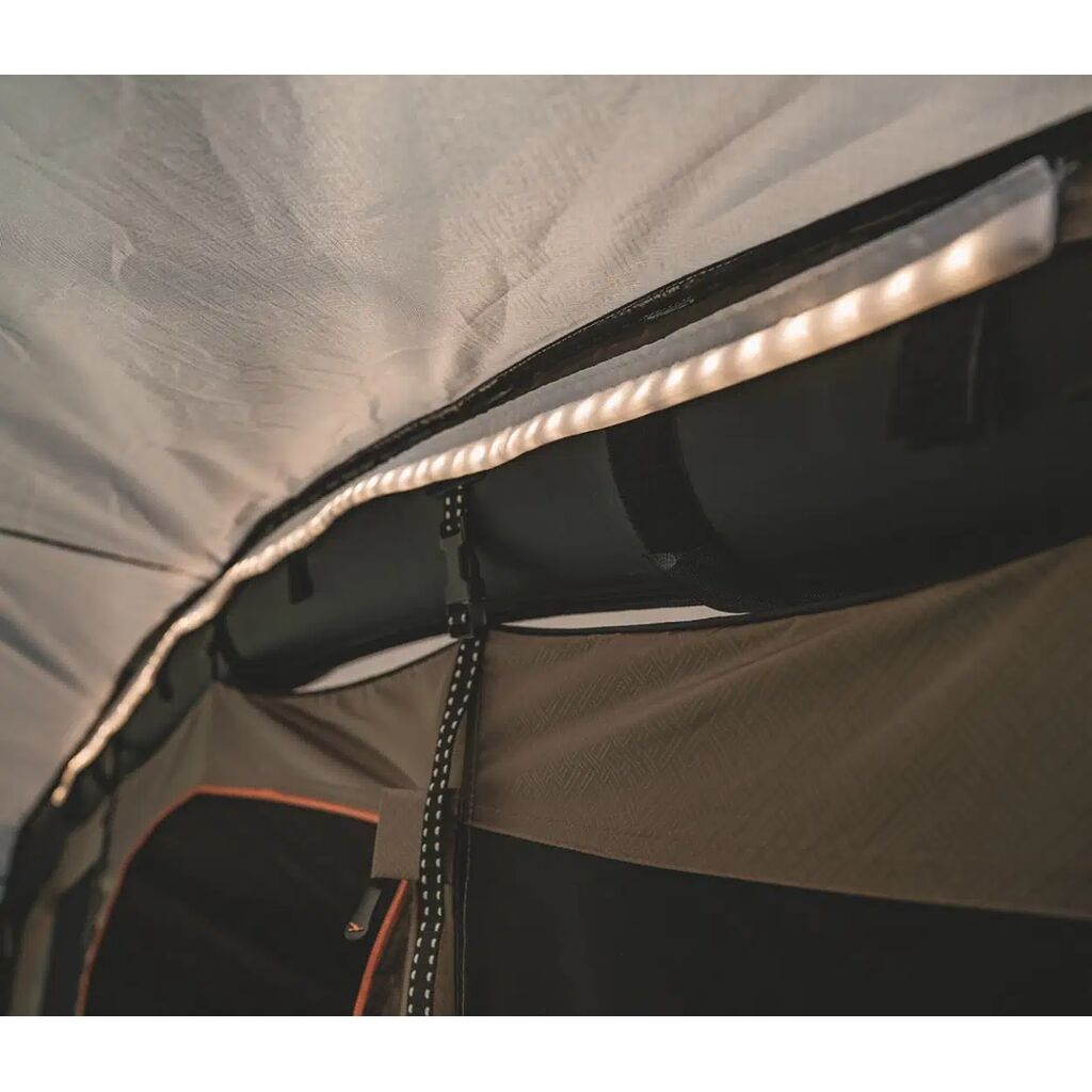 Een 150 cm lange, dimbare LED-lichtsnoer met USB-C-aansluiting. Kan eenvoudig worden bevestigd in geselecteerde Easy Camp-tenten en drive-away-voortenten met geïntegreerde klittenbandsluitingen, of in andere tenten met behulp van de meegeleverde bevestigingsstrips.