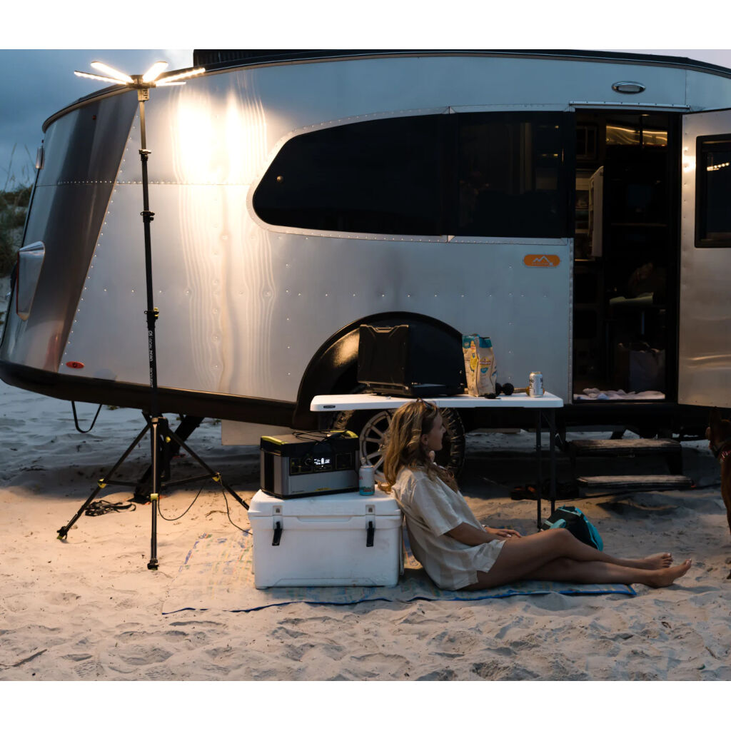 Slimme draagbare buitenverlichting die perfect is voor de kampeertocht of het basiskamp. Dankzij een licht telescopisch statief met een maximale hoogte van 3,6 meter en verstelbare lampen kan het tot 90 meter verlichten, waardoor je goede buitenverlichting hebt, zelfs als het echt donker is. De capaciteit van de lampen is 6.000 lumen, wat je aanzienlijk betere zichtbaarheid geeft dan een gewone kampeerlamp. Het heeft een ingebouwde batterij, maar werkt het beste met een Power Station of met een 12V-bron om het op aan te sluiten.