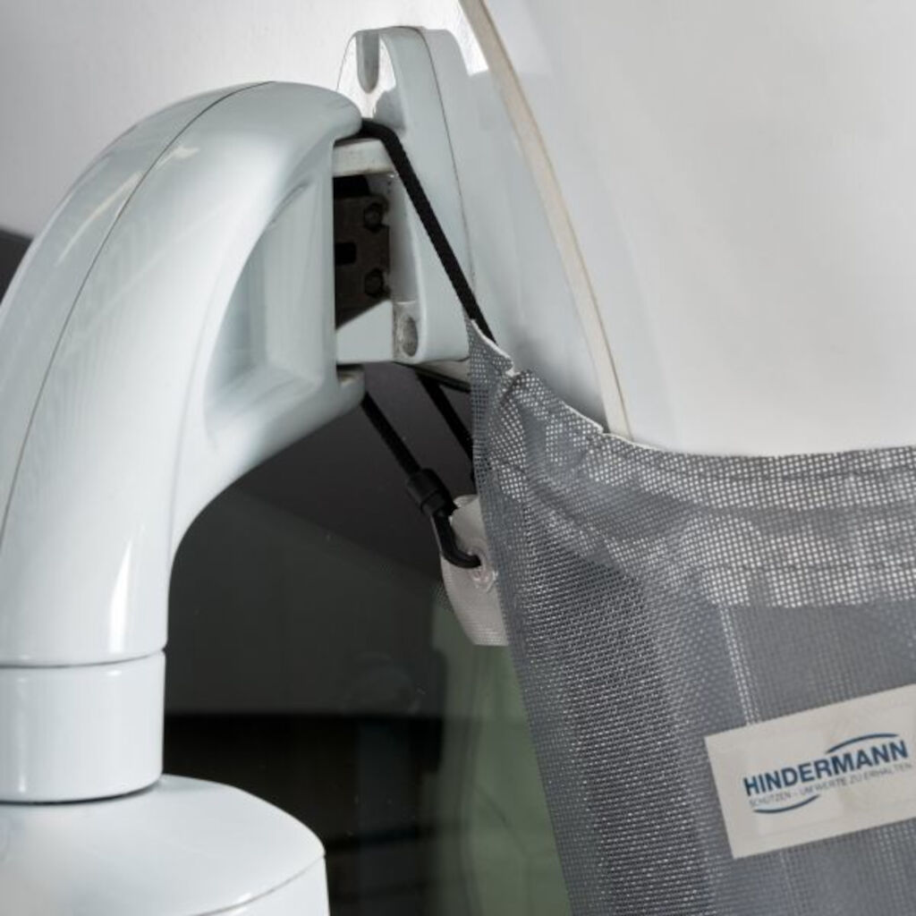 Universele zonnescherm van het Duitse merk Hindermann, een volledig geïntegreerd zonnescherm dat aan de buitenkant van de camper wordt bevestigd. Het zonnescherm houdt de zonnestralen buiten terwijl je nog steeds van binnenuit naar buiten kunt kijken.